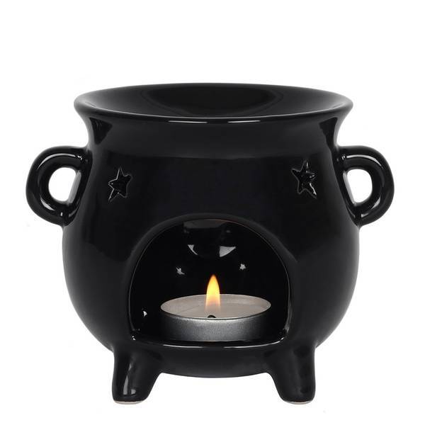 oil burner with design inspired by a black cauldron with cutout star details for use with wax melts