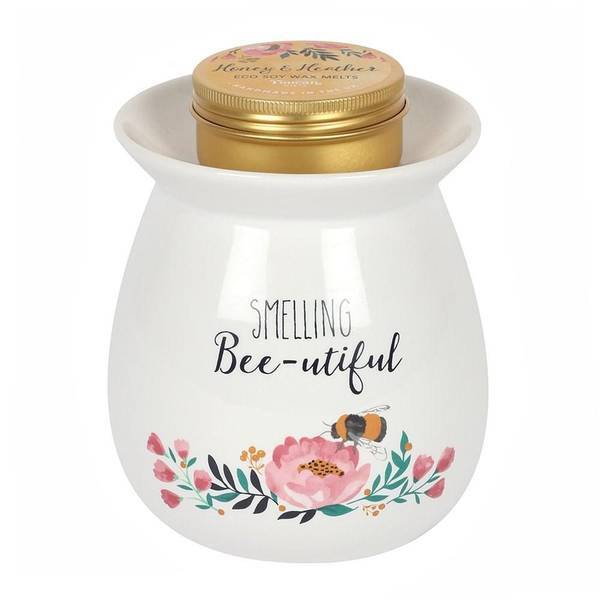 Material: Ceramic, Soy Wax. Design: Bee, Floral. Height: 11cm. Width: 10cm. Depth: 10cm. Contents: Burner, Wax Melts. Packaging: Boxed. Fragrance: Honey & Heather.