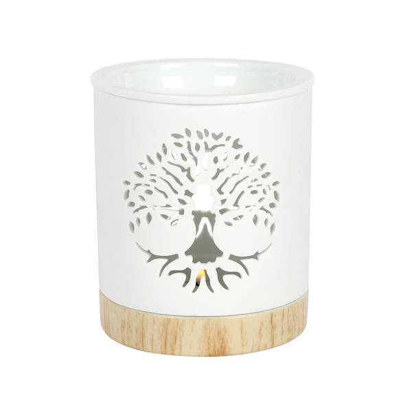 This Something Different burner set features an intricate Tree of Life design cut into its ceramic structure. It is intended for use with wax melts, offering a pleasant sensory experience in your chosen space. The durable ceramic construction ensures longevity for regular home fragrance use.