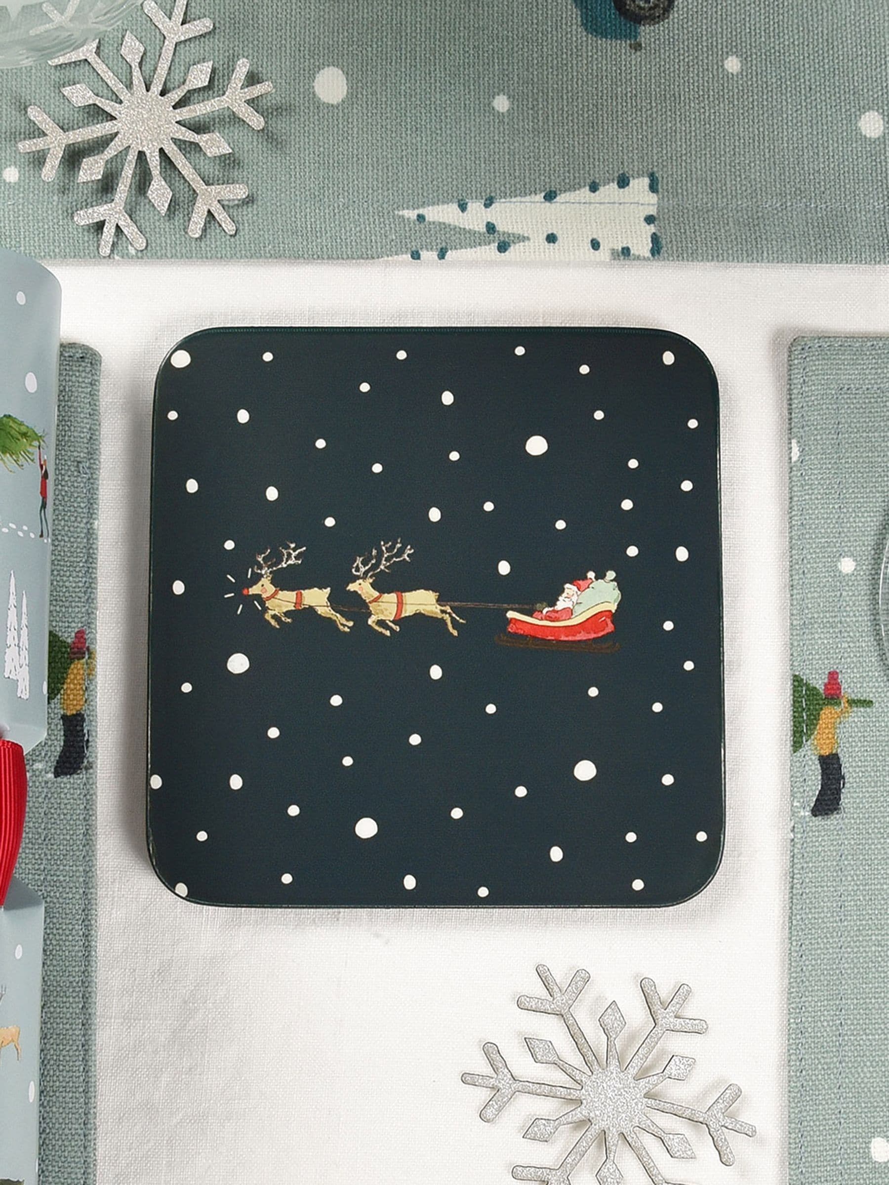 Embrace the magic of Christmas with this charming set of four cork coasters, showcasing a wintry midnight blue sky sprinkled with snowflakes and Santa’s sleigh gliding overhead. A stylish and practical addition to your festive table, these coasters help protect your surfaces while adding a seasonal touch. Set of 4 H 10 x W 10cm Slip-resistant cork backing Superior matt lacquered surface Matching placemats available Part of the Home for Christmas Collection