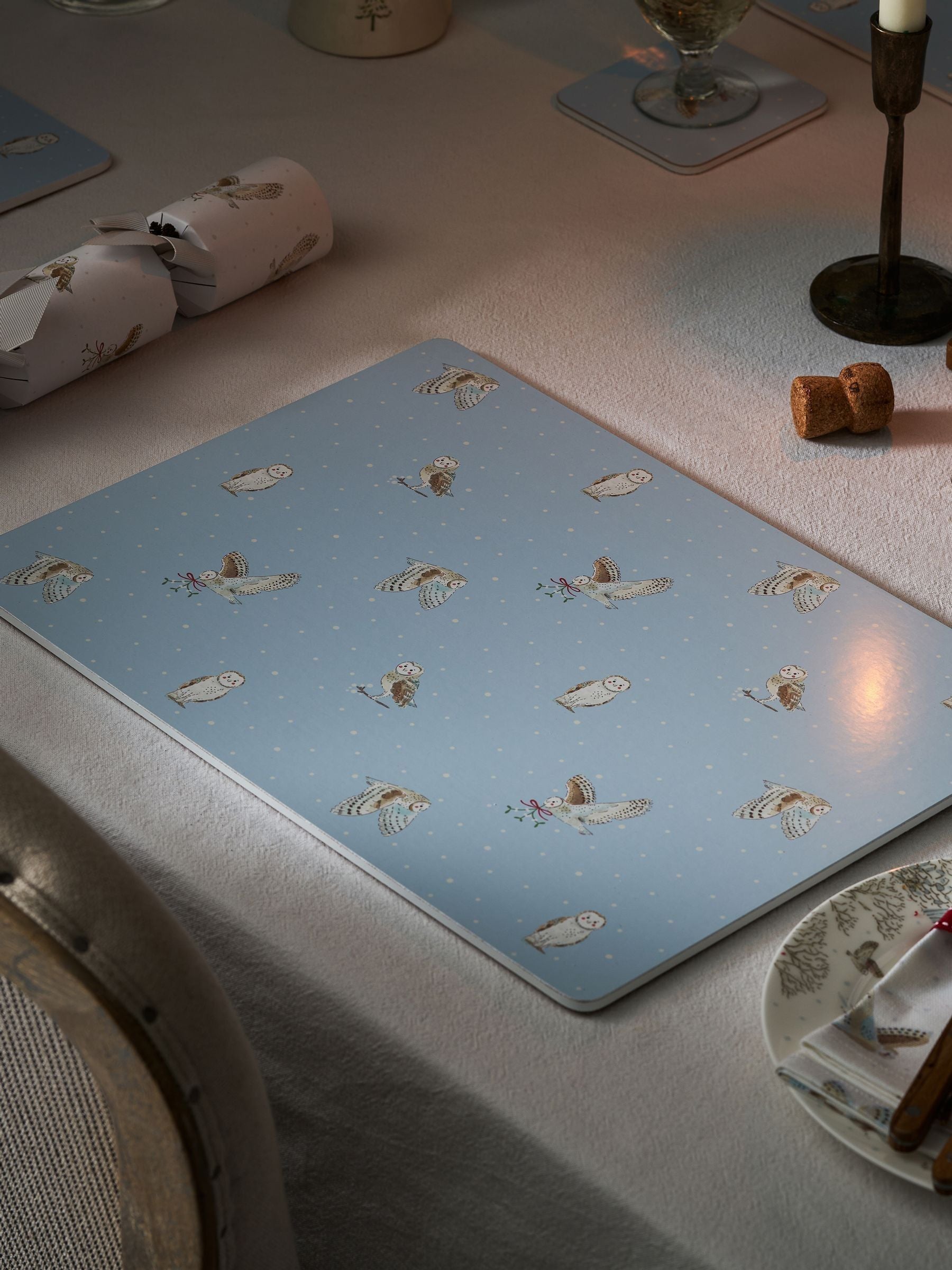 These extra-large cork placemats feature an elegant Snowy Owls design on a light blue, snowy background. Ideal for protecting your table while adding a festive charm, they are a stylish and practical addition to your Christmas table setting. Set of 2 H 29 x W 40 x D 0.5cm Made from cork with a matt lacquered surface Heat resistant to 110 degrees Pale blue rim Pattern may vary slightly Coordinating items available in the Snowy Owls collection