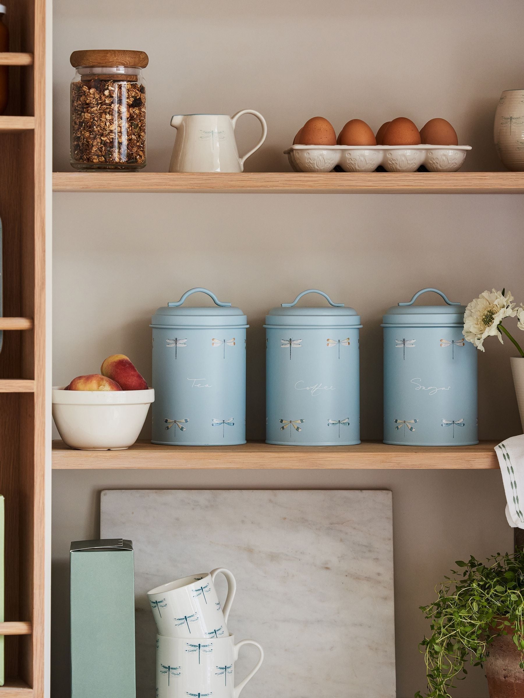 Bring both elegance and organisation to your kitchen with this beautifully coordinated set of dragonfly-themed storage tins. The delicate illustrations create a timeless, sophisticated look for your tea, coffee, and sugar essentials. Set of 3 tins for tea, coffee, and sugar storage Diameter: 11cm Capacity: 1.5 litres each Crafted from galvanised steel Tea , Coffee , and Sugar labels in handwritten style Part of the Dragonfly collection