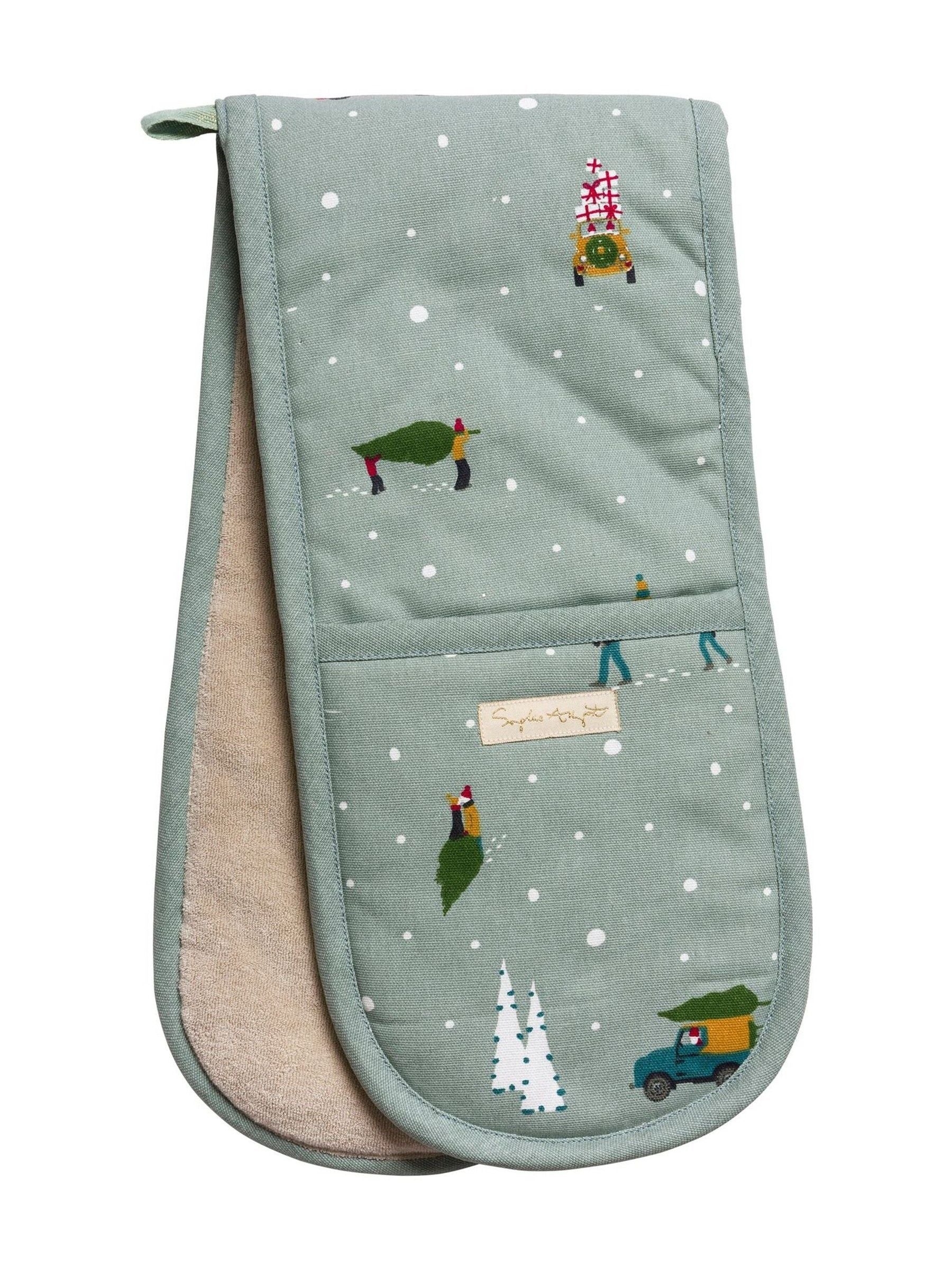 Capture the joy of the festive season with this charming oven glove, featuring Christmas trees and gift piled sleighs and cars on a wintry blue backdrop. Perfect for protecting your hands while preparing festive feasts, it’s a must-have for any seasonal kitchen. L 84 x W 18cm Made from 100% cotton Polyester thermal layer Hanging loop for easy storage Part of the Home for Christmas Collection