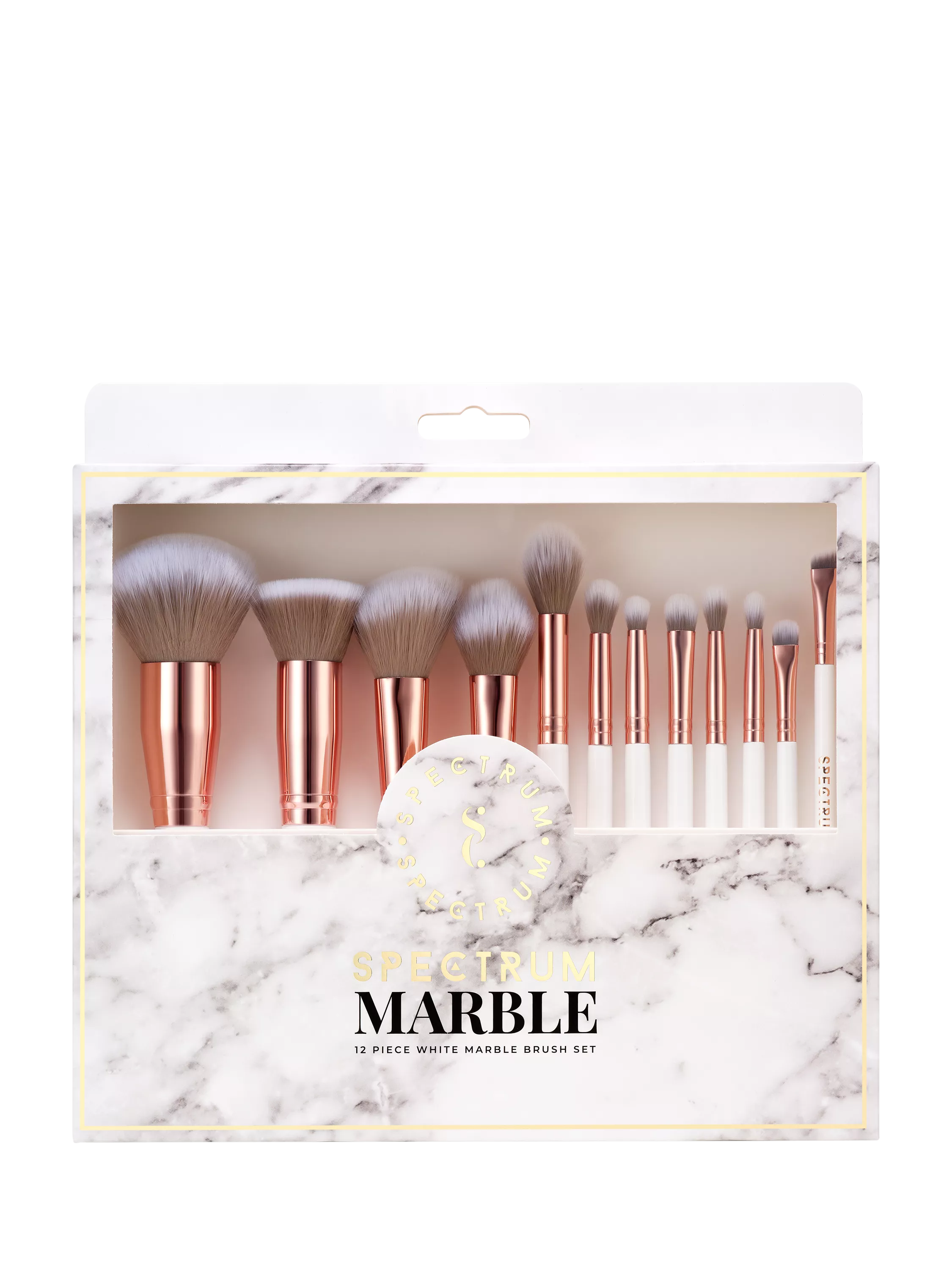 Our 12-piece set of marble makeup brushes is finished in a stunning rose gold, grey and white colourway.