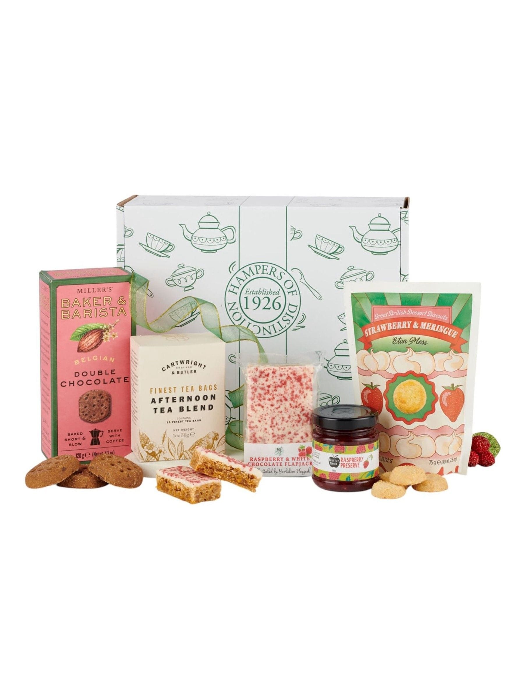 Yorkshire Flapjack Raspberry & White Chocolate Flapjack 90g, Cartwright & Butler English Afternoon Tea 10 Bags 30g, Great British Desserts Strawberry & Meringue 75g, Fruits of The Forage Raspberry & Wild Apple Preserve 105g, Millers Baker & Barista Morello Sour Cherry Biscuits 120g. Packed in a Kraft Gift Box.