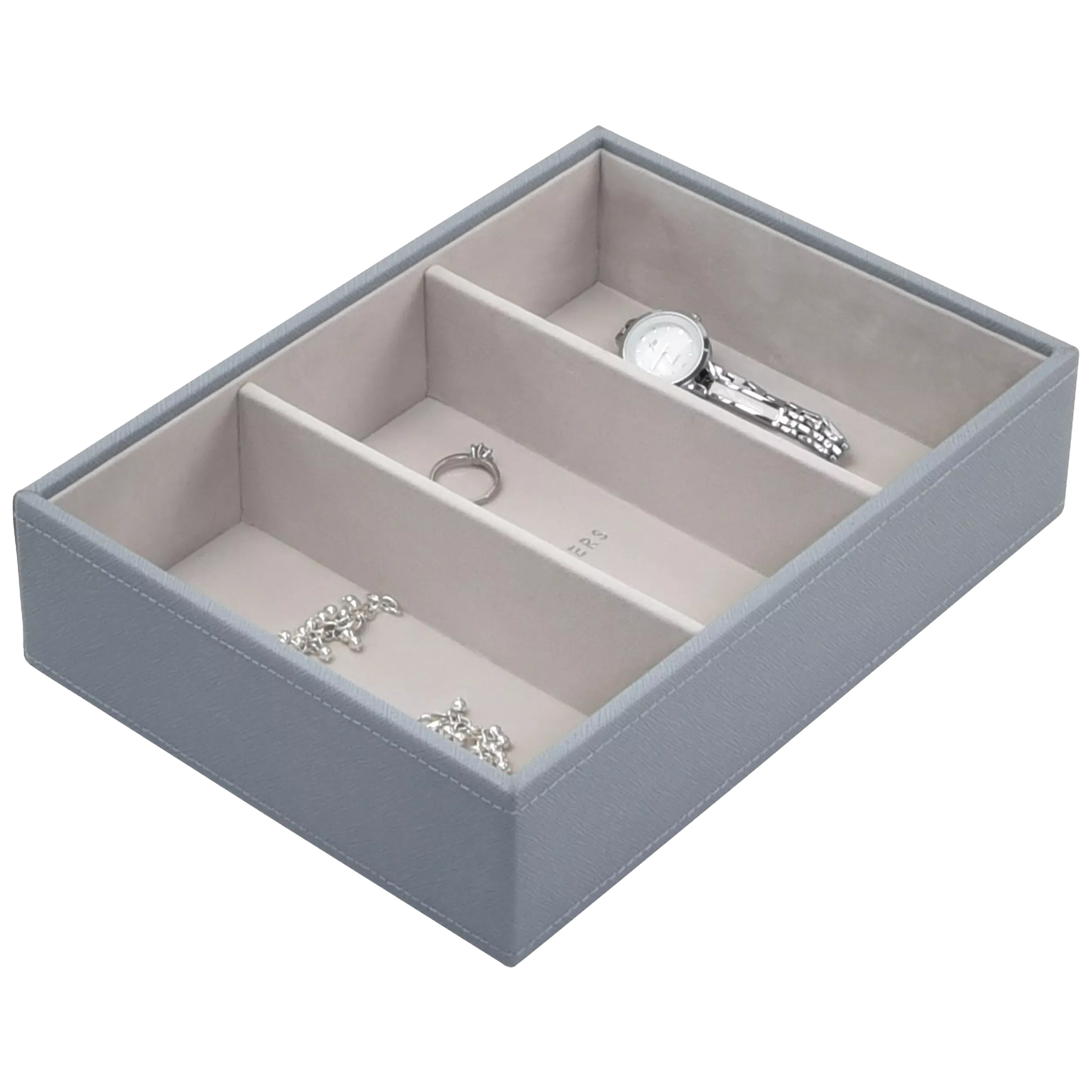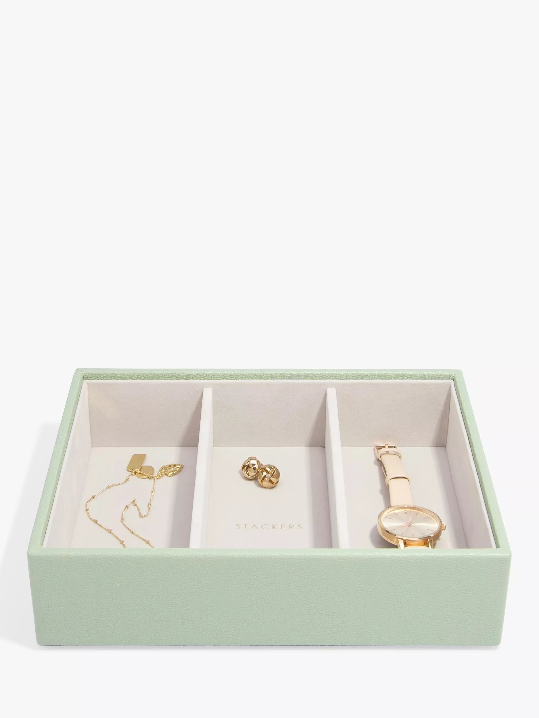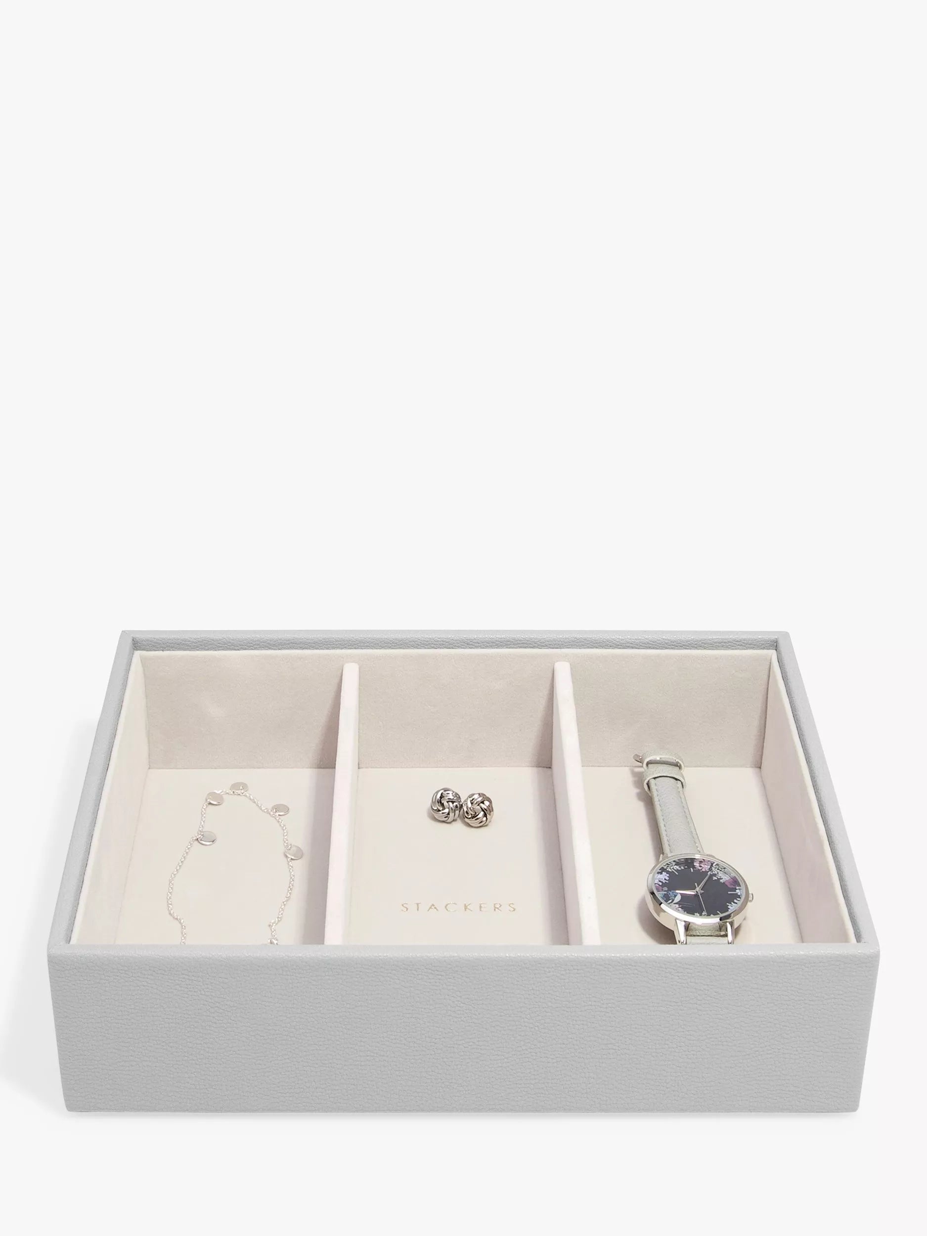 The perfect home for your watches, bracelets and glasses as you can store at least three pairs of sunglasses, 6 watches and even a dozen bracelets within this deep 3 section velvet lined tray. Stackers are designed the same size, so you can mix and match the colours and compartments you need.