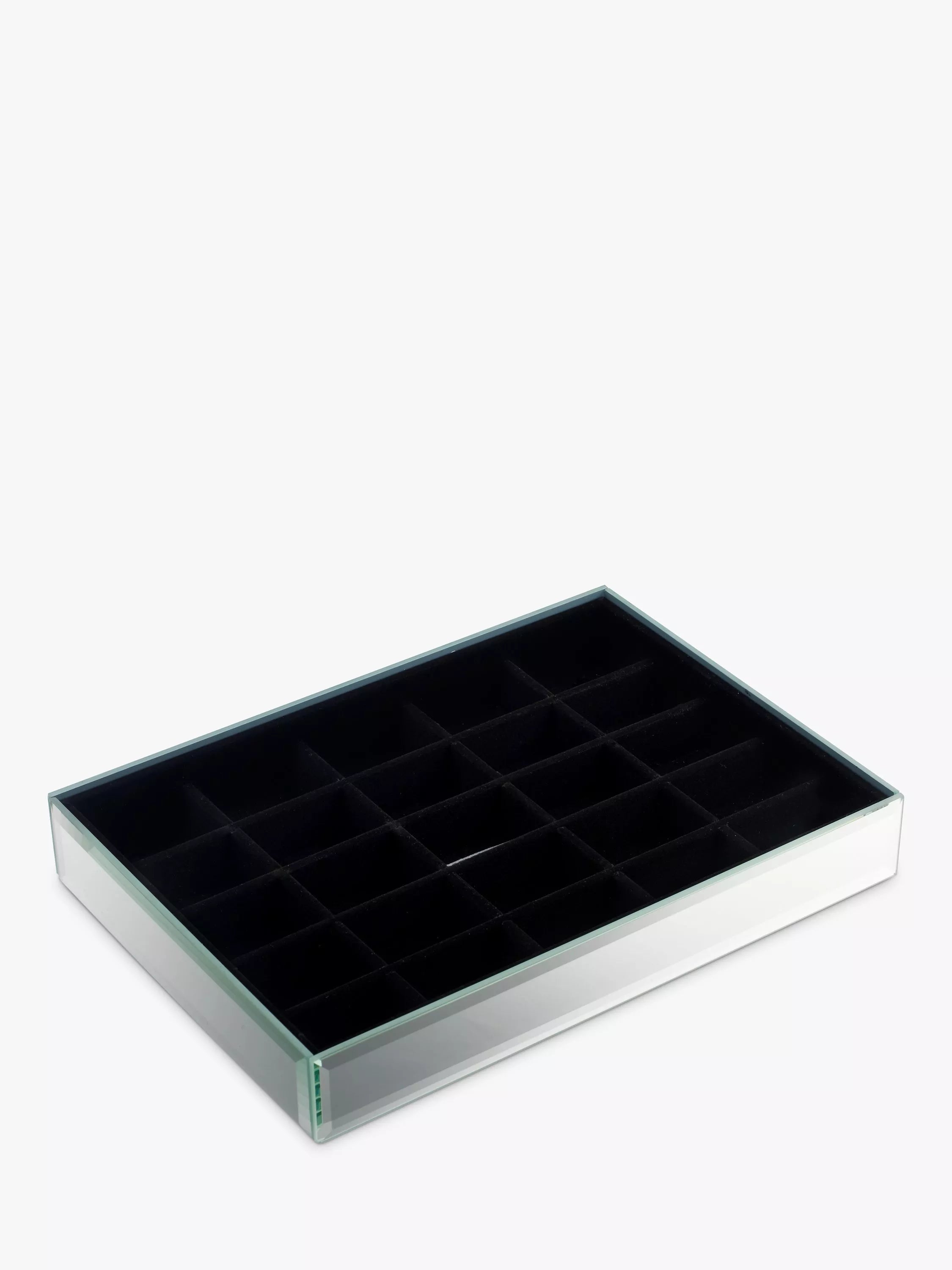 A unique piece, this jewellery box contains as many as 25 sections for storing your precious earrings. Its design features black faux suede lining.