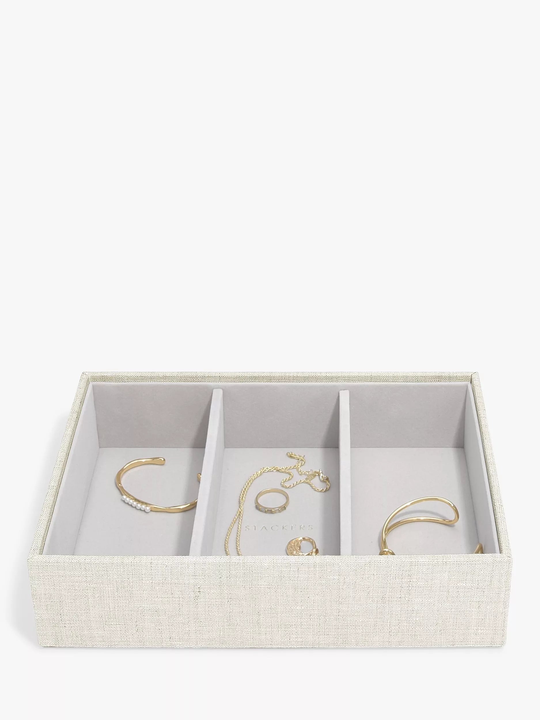 The Watch & Accessories Layer is a deeper layer, designed to hold watches and large accessories within the 3 sections. Add this layer to your Stackers jewellery box or use as stand-alone storage on a dresser or in a drawer. For even more storage options, you can also add a Ring Roll, Watch Pad, or Medium Travel Jewellery Box to hold your jewellery securely.