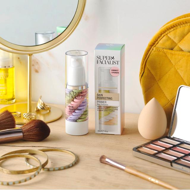 Dermatologically tested.Create a flawless looking complexion with the Super Facialist Skin Perfecting Primer. Expertly blending trusted skincare ingredients and colour correcting pigments, this multi-tasking primer blurs imperfections by counteracting three common skincare concerns of redness, sallowness & dullness. At the same time, working to help bring back your skinâs natural radiance.Hyaluronic Acid â helps hydrate & improve skinâs ability to hold moistureNiacinamide â helps control oil and improve skin textureCica â helps soothe, comfort & calmColour Correcting TechnologyGreen â tones down rednessLavender â counteracts sallownessPeach â improves dullness