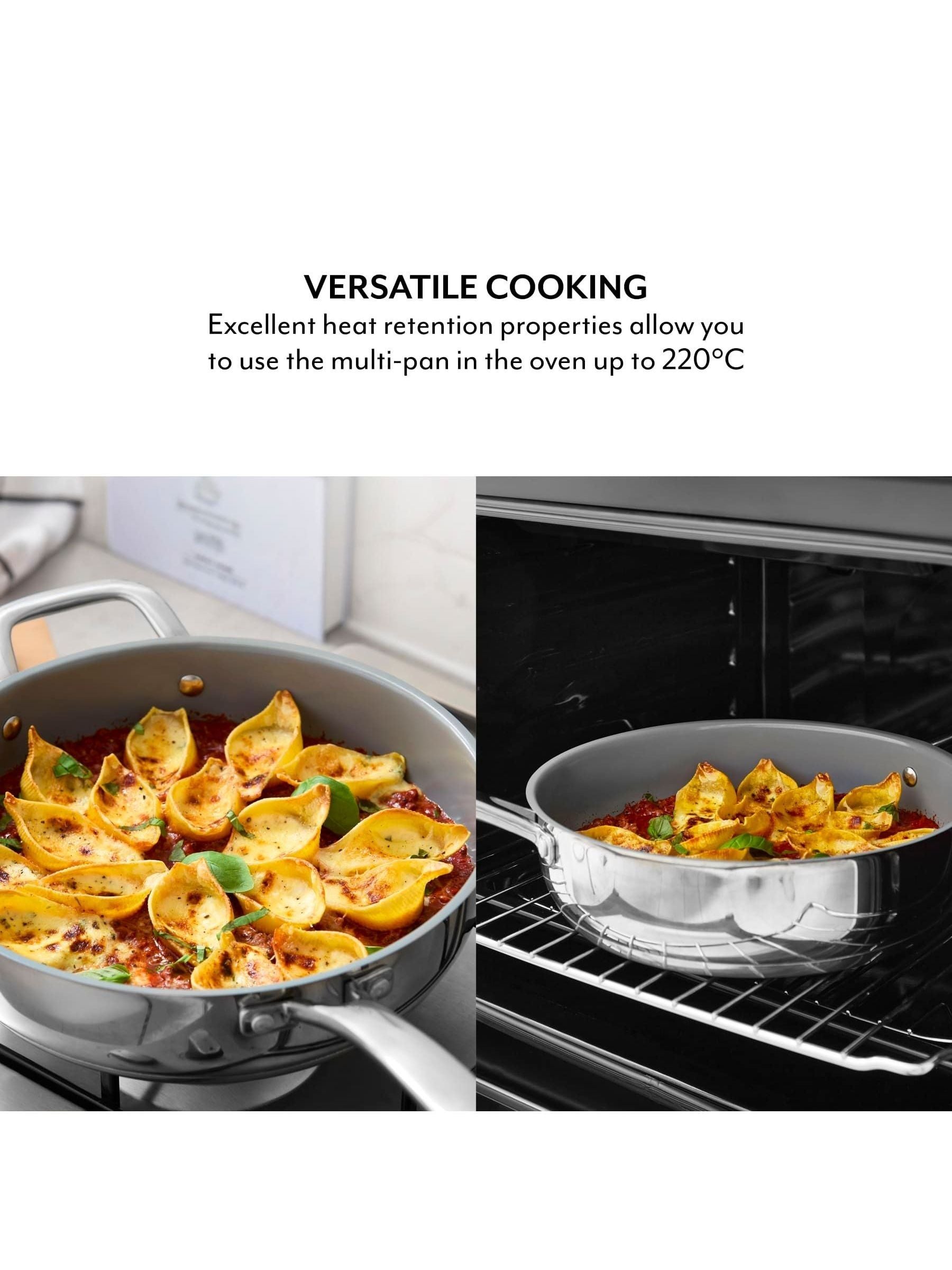With over 50 years of cooking expertise, here at Sur La Table, we know a thing or two about what equipment is needed to get the job done. Whether you are an aspiring chef or just cooking a hearty meal for the whole family to enjoy, this 28cm Multi-pan will make the whole process simpler. Expertly crafted from 0.6mm stainless steel the pan is durable and can tackle any culinary challenge with ease so you can easily sear the perfect steak, create creamy risottos or sauté vegetables for a casserole or fajitas. It provides complete versatility as the stainless steel and aluminium encapsulated base allows you to use the pan on any hob type, including induction, whilst it can also be used in the oven up to 220°C so you can add the finishing touches to your favourite dishes. Featuring a superior ceramic coating that is 10x stronger than standard non-stick coatings, you create healthier meals for the whole family. The coating is free from PTFE, PFOA, PFAS, Lead and Cadmium so there is no risk of any unwanted toxins getting into your food. The riveted steel handle offers comfort and a firmer grip when cooking, whilst it is also dishwasher safe to make cooking fuss-free from start to finish. SUITABLE FOR ALL HOB TYPES: The stainless steel & aluminium encapsulated base provides superior heat conductivity and heat distribution whilst the pan can be used on any hob type, including induction for versatile cooking. It is also safe to use the pan in the oven up to 220°C so you can easily add the finishing touches to your favourite dishes. SUPERIOR CERAMIC COATING: Superior ceramic coating is 10x stronger than traditional non-stick coatings and offers superior food release and healthier cooking with little to no oil required. It is free from PFOA, PTFE, PFAS, Lead & Cadmium for toxin free cooking and you can safely use wooden and nylon utensils without damaging the pan. RIVETED STEEL HANDLE: Cooking requires a lot of elbow grease (literally and figuratively), so it’s important you are at the top of your game. The riveted handle is highly durable and can withstand a busy kitchen of moving and pouring. A sturdy helper handle on the other side of the pan adds additional support when serving to avoid spillages. SATIN INTERIOR & MIRROR FINISH: The mirrored exterior offers a beautiful, polished finish that is sure to draw the eye and adds an extra layer of protection from scratches & dents to ensure longevity. This is perfectly complemented by the sleek satin interior which has a subtle sheen that reflects light to create a vibrant & inviting aesthetic for your kitchen. 10 YEAR GUARANTEE: Enjoy long-lasting quality from Sur La Table with a 1 year guarantee and 9 year extension, subject to product registration online.