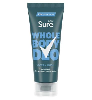 Read MoreStay fresh all over with Sure Men Ocean Rush Whole Body Deodorant. This aluminium-free deodorant for men provides 72 hours of odour control so you can overcome your limits. Our whole body deodorant features Sure’s patented Body Adapt Technology, which stops odour before it even starts. This men's deodorant cream offers a herbal and woody scent with a clean, fresh feel. Its quick-drying formula leaves less residue and feels light and refreshing on the skin, providing nearly instant freshness.