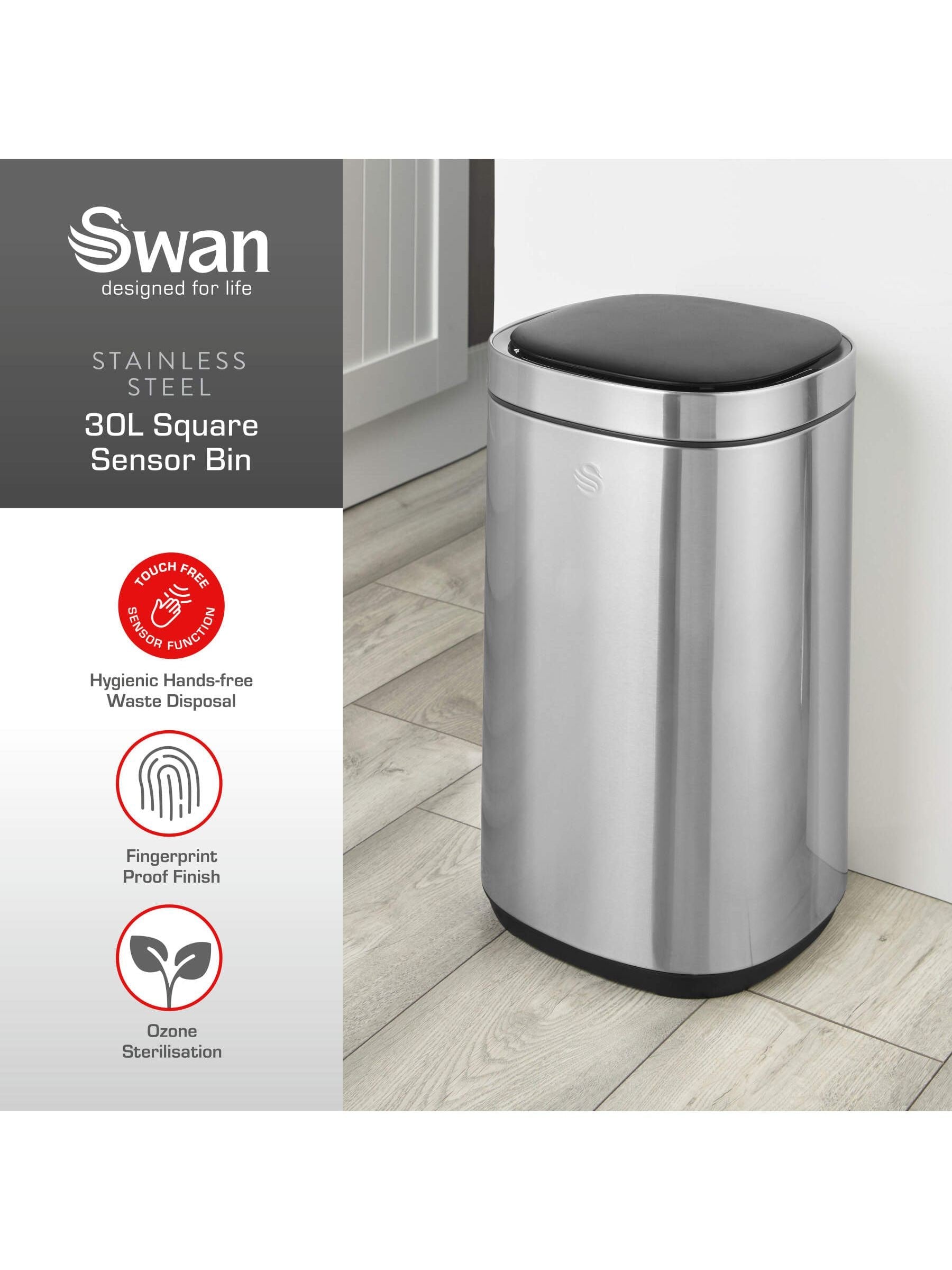 This stylish Swan 30L square kitchen sensor bin makes everyday waste disposal easier than ever. Featuring an infrared motion sensor, you just approach the bin or swipe your hand near the sensor bar and the lid opens automatically. This is really helpful when you have your hands full. The lid then closes after 5 seconds of no activity, providing hands-free and more hygienic waste disposal than standard bins. It also features the innovative Ozone odour sterilisation, a fuss-free way to reduce bacteria and odours from your bin. With a simple button press, the ozone cycle filters out particles through the lid, giving you fresher air and a cleaner environment. The bin is made from high quality stainless steel, complete with fingerprint proof finish for durability to withstand intense everyday kitchen wear and tear. To help keep your liner secure, the removable retainer ring locks your bin liner into place. The plastic inner bucket is resistant to stains and odours, needing just a simple wipe down with a damp cloth to clean. It’s must-have for any modern home. Requires 6 x AA batteries (Not included). 30L SENSOR BIN: This stylish Swan square kitchen sensor bin features a 30L capacity for disposing your everyday waste. Just approach the bin or swipe near the sensor bar and it opens automatically. It closes after 5 seconds of no activity, providing hands-free and hygienic waste disposal. DURABLE, LONG-LASTING DESIGN: The bin’s body is made from high quality stainless steel, complete with a fingerprint proof finish. You get long-lasting durability to withstand everyday wear and tear in the home. OZONE ODOUR STERILISATION: Innovative Ozone odour sterilisation is a fuss-free way to reduce bacteria and odours from your bin. With a simple button press, the ozone cycle filters out particles through the lid, giving you fresher air and cleaner environment. PLASTIC LID & INNER BUCKET: This stainless steel bin features a lightweight plastic lid for added durability and to seal in odours. The plastic inner bucket is resistant to stains and odours, making it easy to clean. It also features a removable retainer ring that keeps the bin liner in place. 5 YEAR GUARANTEE: Assured Swan quality with a 1 year guarantee & optional 4 year extension, subject to product registration online.