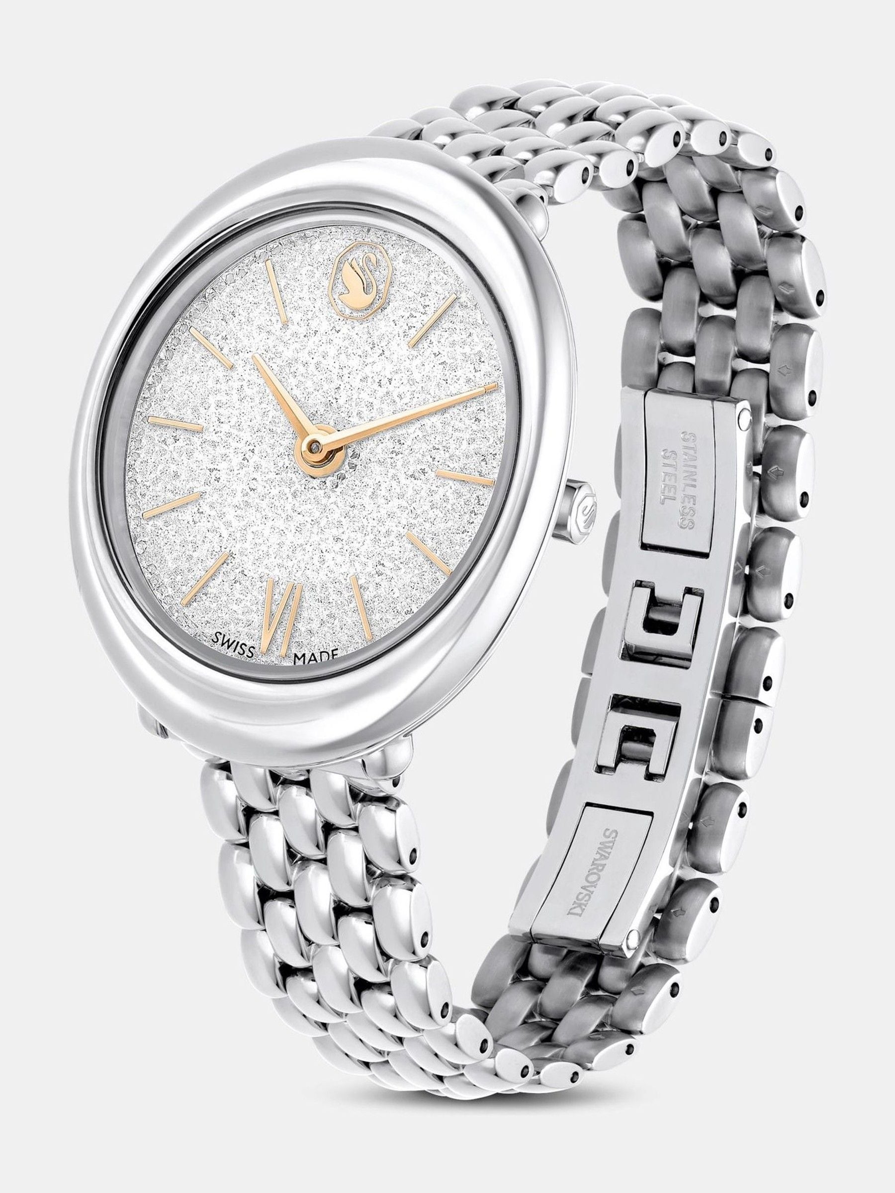 Additional details are gold-tone finished, including the hour markers and hands, as well as the single Roman numeral at 6 o’clock, and Swarovski’s iconic swan logo at 12 o’clock.