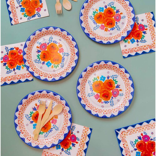 These Talking Tables Boho Floral Paper Napkins feature a bright orange and blue floral design ideal for summer gatherings and themed celebrations. They offer a visually appealing yet practical element for your table setting.