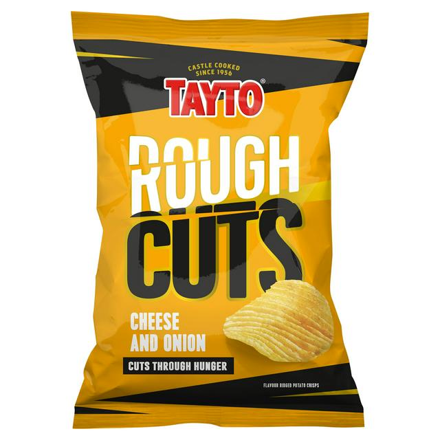 Product details Description Cheese and Onion Flavour Ridged Potato Crisps Castle Cooked Since 1956 Cuts Through Hunger Suitable for vegetarians Feeling hungry and need to get it sorted? Grab a pack of 'rough cuts', they're thick, ridged and sure to handle any rumble The crisp that cuts through hunger! Tayto,... Read More