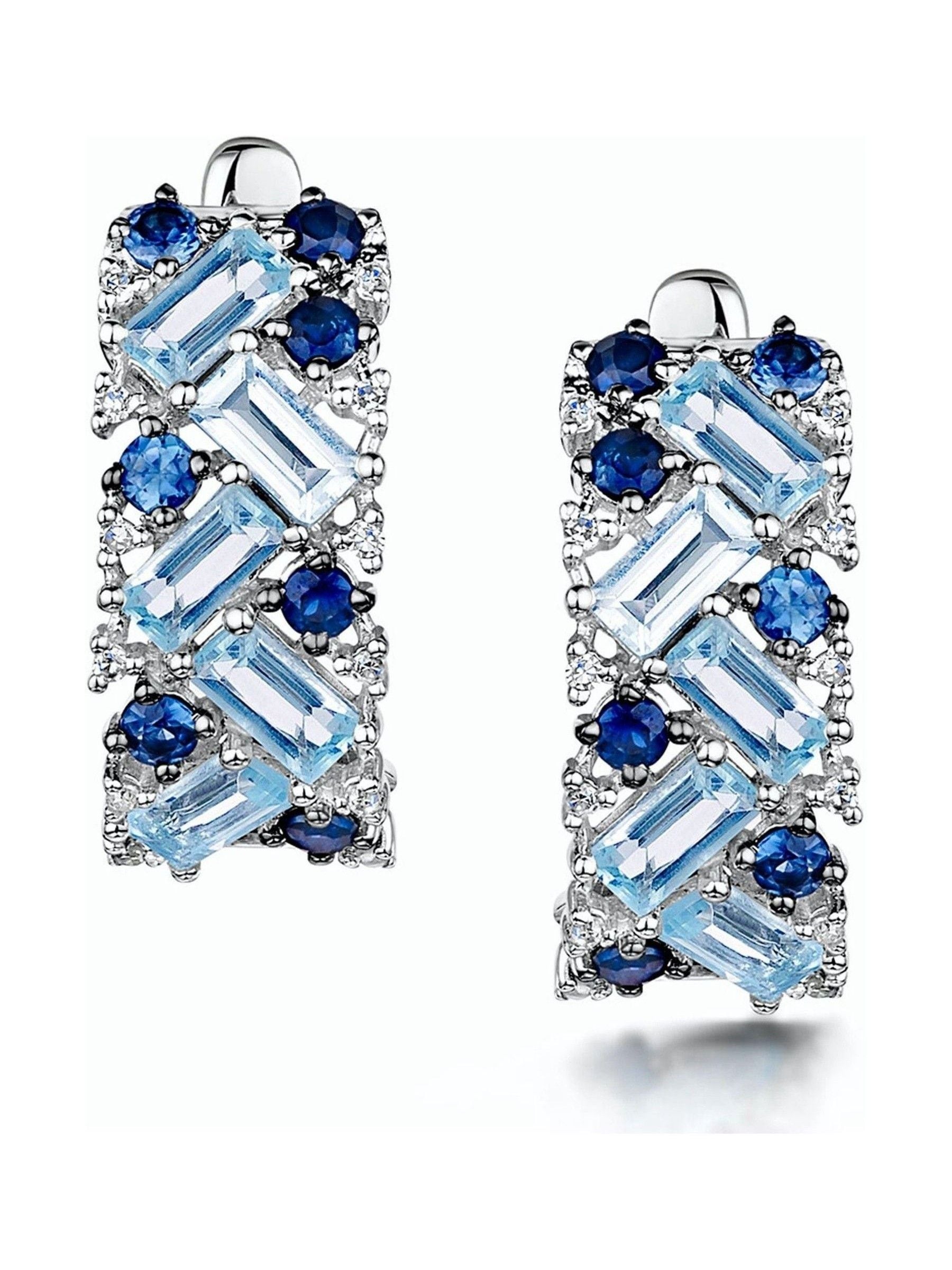 A truly breathtaking and unique pair of huggy earrings with a setting of round blue sapphires and baguette-cut blue topaz.