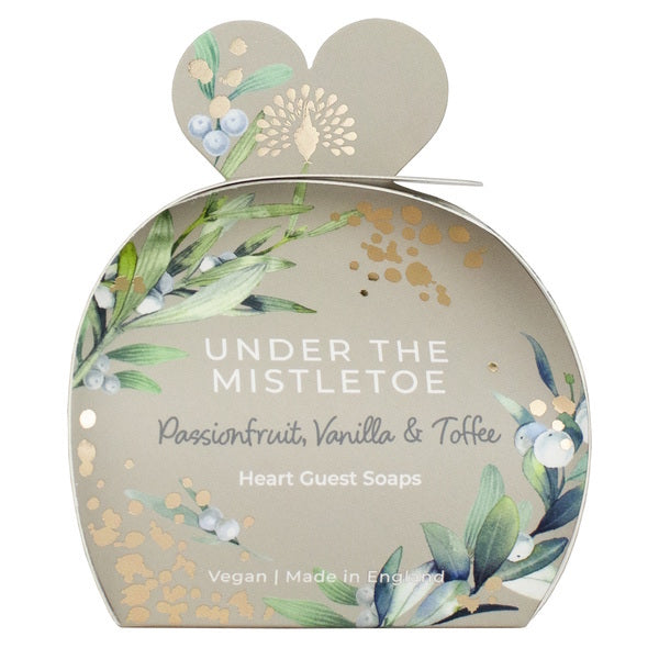 3 x 20g heart-shaped soap barsFragrance: Pineapple, lemon and mandarinCruelty-free and vegan friendlyPlastic-free, fully recyclable packagingMade in England Experience festive luxury with the Under the Mistletoe Heart Guest Soaps from our Christmas Tidings Collection. Containing three mini heart-shaped soap bars, this beautifully packaged gift box is adorned with mistletoe and small bunches of white berries. Sparkling gold foiling adds a touch of magic, making it the perfect stocking filler, table favour or a luxurious little gift. The Under the Mistletoe Heart Guest Soaps are fragranced with uplifting notes of pineapple, lemon and mandarin, with a heart of passionfruit, dewberry and spicy cumin. Leading into a rich base of patchouli, vanilla, toffee and musks.