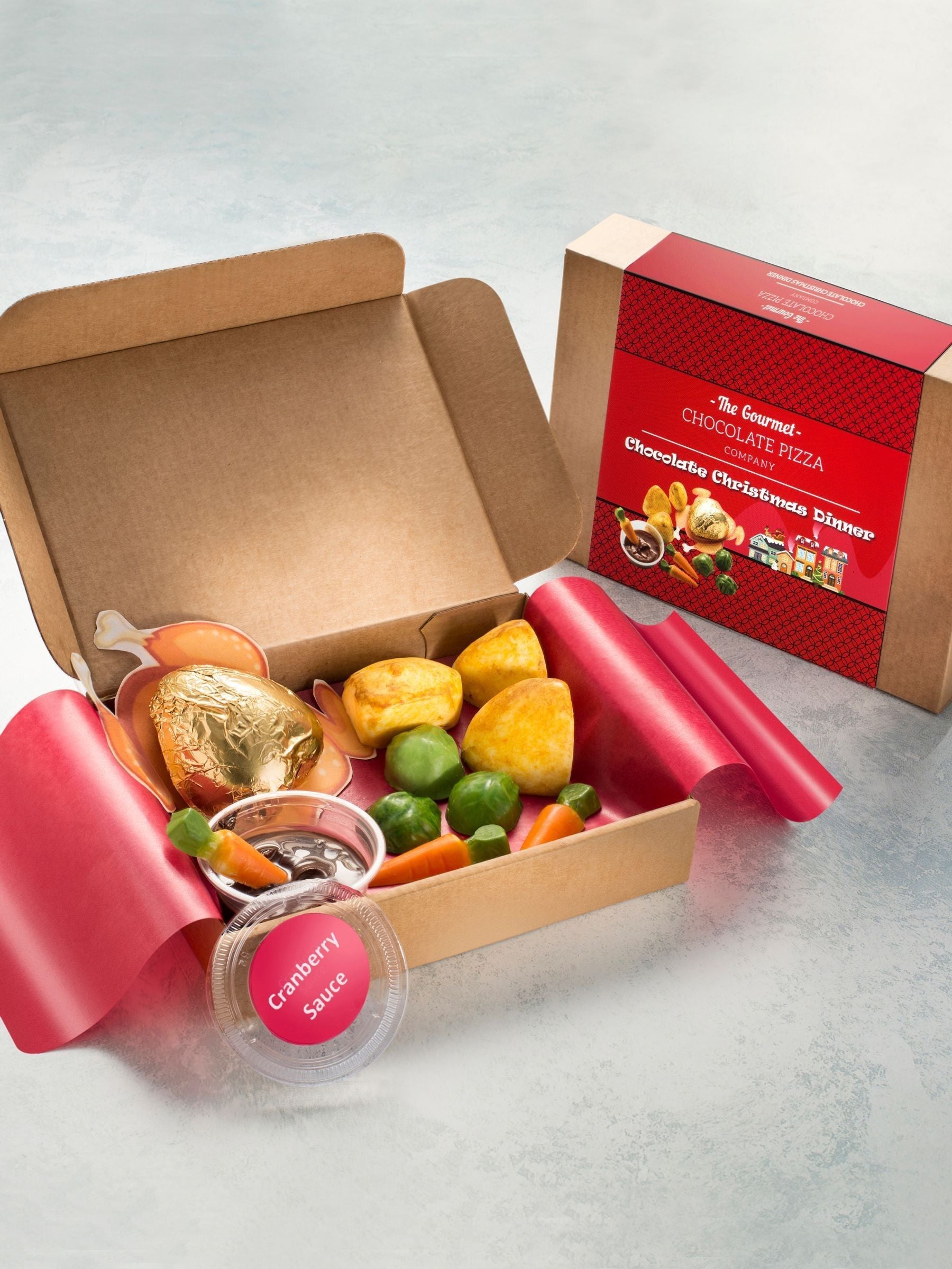 Your Christmas dinner couldn't get any better! Featuring a festive feast with all the trimmings including a milk chocolate turkey, milk chocolate carrots and brussel sprouts, and white chocolate roast potatoes. Not forgetting the cranberry sauce (raspberry flavour) to dip the carrots into or even the turkey! Be the envy at the dinner table and enjoy the fun of your chocolate roast Christmas dinner. They say at Christmas you can have chocolate for breakfast, well now you can have it for lunch too!