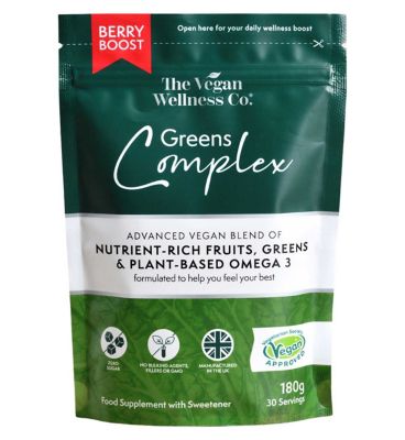 The Vegan Wellness Co. Greens Complex Berry Boost is a nutrient-dense food supplement designed for daily wellness support. This 180g pouch contains an advanced vegan blend formulated to help you feel your best. It provides 30 servings of this carefully selected mix of fruits and greens.