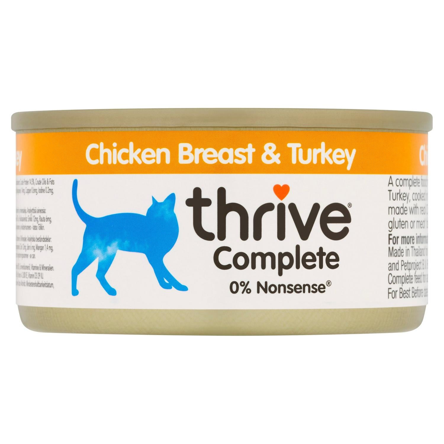 Thrive Complete presents a quality meal featuring authentic chicken breast and turkey ingredients for your cat. This nutritious wet cat food is gently prepared and simmered in a savoury chicken stock base. It is designed to be a complete food source, meeting your pet's daily requirements effectively.