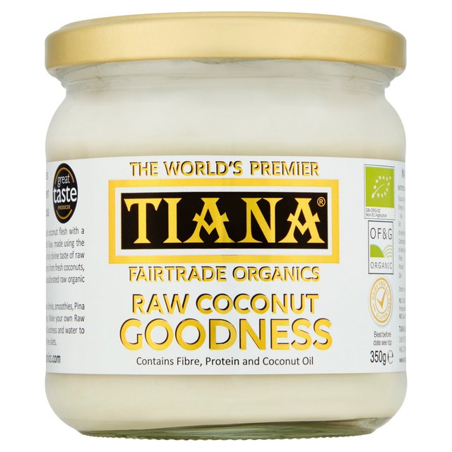 Tiana Fairtrade Organics raw coconut goodness great taste and multi-consumer awards winner premium quality, nutritious, heavenly deliciousTiana Fairtrade Organics Raw Coconut Goodness is pure unsweetened coconut flesh with a smooth creamy consistency from selected fresh organic coconuts. 100% Raw, made using the latest cold pressing technology below 40°C, it melts in your mouth for a truly divine taste of raw coconut. A wholefood containing dietary fibre, protein and all the nutrients from fresh coconuts, therefore not suitable for frying. No additives or preservatives, only unadulterated raw organic coconut goodness.
