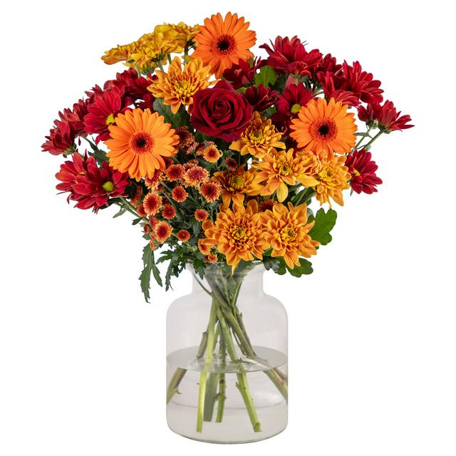 This vibrant fresh flower bouquet arrives pre-arranged in a classic clear glass vase for immediate display upon arrival. The striking selection features warm autumnal colours, creating an inviting focal point in any room. This ready-to-enjoy floral gift offers superior convenience and lasting visual appeal for your home decor.