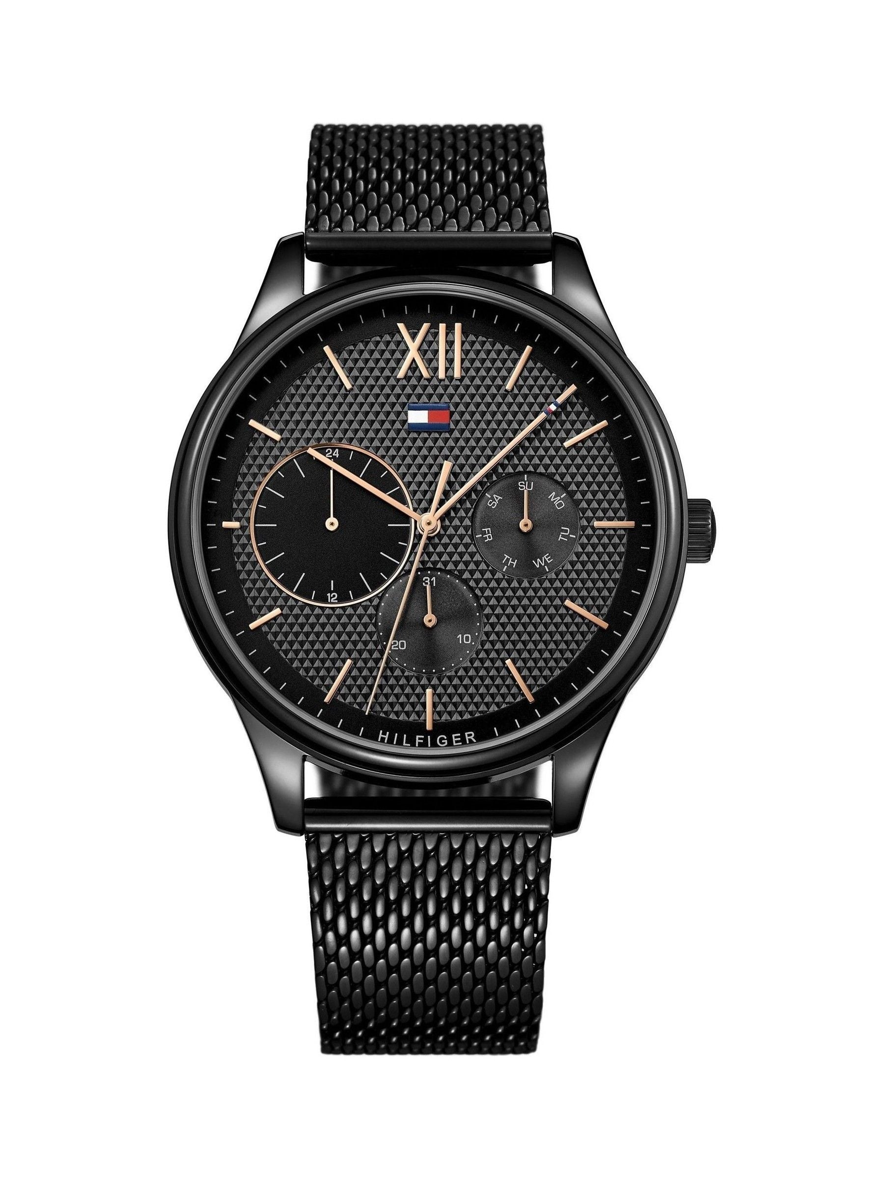 Tommy Hilfiger mens sophisticated sports watch. Featuring a 44mm black dial, black IP case and black IP mesh bracelet.