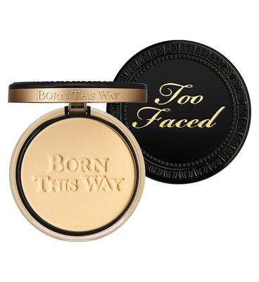 Discover the Too Faced Born This Way Multi-Use Powder Foundation, presented in an elegant black and gold compact. This pressed powder is engineered to deliver buildable coverage while maintaining a natural skin appearance. Its sophisticated design makes it an appealing addition to any makeup collection.