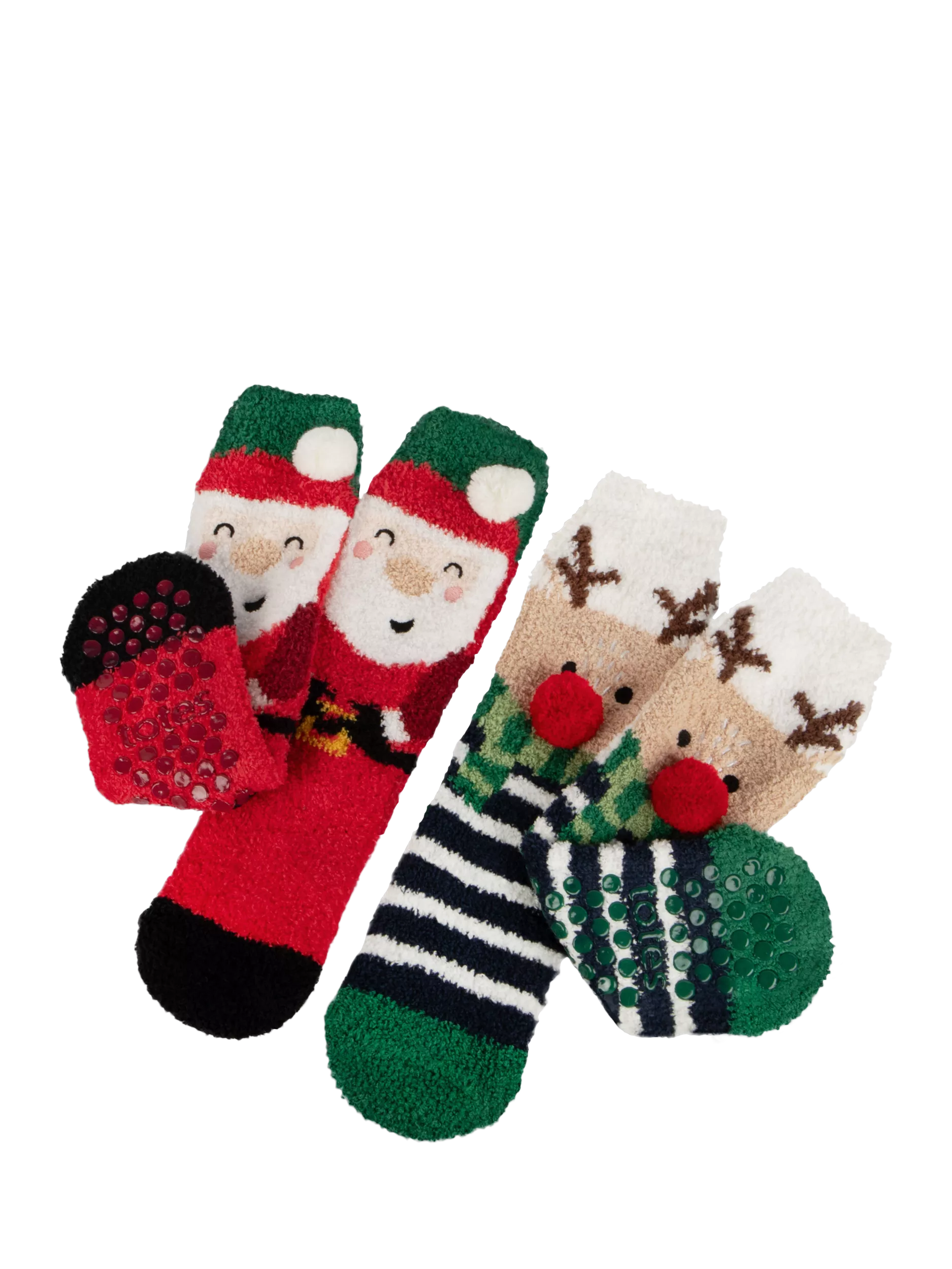 It's beginning to look a lot like Christmas with this handy twin pack of super soft and super cute totes® toasties® slipper socks for the younger members of the family. Featuring cheerful Santa and Rudolph designs, both pairs come with slip-resistant tread for safety during winter's indoor play days.