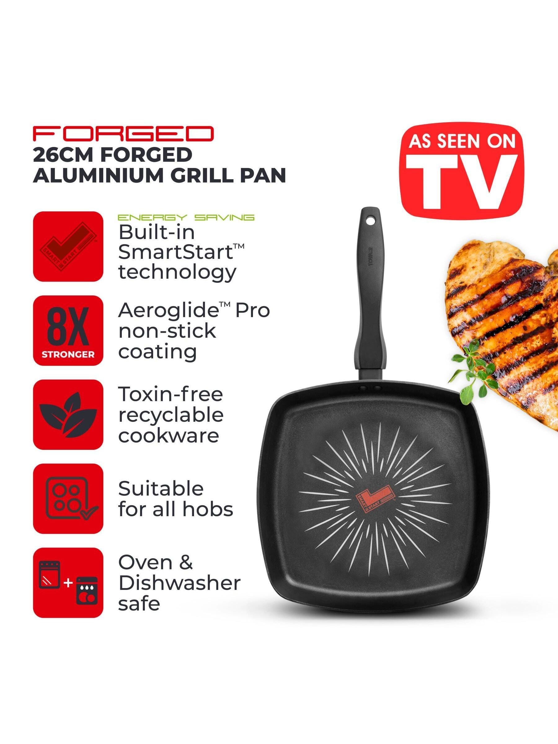 Presenting the innovative SmartStart technology, the 3.5mm forged aluminium grill pan enables you to start cooking like a Pro. Perfectly cook a juicy steak by keeping an eye on the indicator tick in the middle of the pan. When it changes to dark red, the optimum temperature of 200 degrees Celsius has been reached, so it is ready for you to add your ingredients. The 4 layer non-stick Aeroglide Pro interior coating is 8x stronger compared to standard non-stick coating. It's free from PFOA, lead and cadmium, allowing you to cook healthy meals without harmful toxins. The grill pan has a Bonded Steel Induction-ready base with ergonomic Softtex handle offering a comfortable grip and full manoeuvrability when cooking. It is suitable for all hobs, including induction hobs. It is also dishwasher friendly for low maintenance cleaning, although hand washing is recommended to maintain the quality finish.. SMARTSTART TECHNOLOGY: A temperature sensor is built into the non-stick coating that changes from bright red to dark red as soon as the grill pan reaches the optimum temperature. Simply pop the pan on the hob to heat up, wait for the SmartStart tick to change to dark red and take the guesswork out of cooking for perfect results every time. AEROGLIDE PRO NON-STICK COATING: Exclusive to the SmartStart Forged range, the 4-layer coating is 8 times stronger compared to standard non-stick coatings for superior food release and easy cleaning. The exterior is finished with a heat-resistant coating for improved safety. The durable Aeroglide Pro coating ensures that you can use nylon and wooden utensils without risking any damage to the grill pan. PREMIUM QUALITY CONSTRUCTION: This SmartStart Forged grill pan is free from harmful chemicals such as PFOA, Lead and Cadmium. The pan is lightweight and ultra-tough, thanks to expertly crafted 3.5mm thick forged aluminium. Great heat conductivity properties and lightweight design ensure quick heat-up time with easy manoeuvrability. SUITABLE FOR ALL HOB TYPES: Bonded Steel Induction Ready base offers the versatility to use on any hob type, including induction. The pan is oven safe up to 170 °C for up to 40 minutes, giving ultimate versatility for use either on the hob or in the oven. ERGONOMIC SOFTTEX HANDLE: Ergonomic Softtex handle for a cool and comfortable grip and easy manoeuvrability when cooking. 5-YEAR GUARANTEE: Trusted Tower quality with a standard 1-year guarantee and 4-year extension, subject to product registration online.