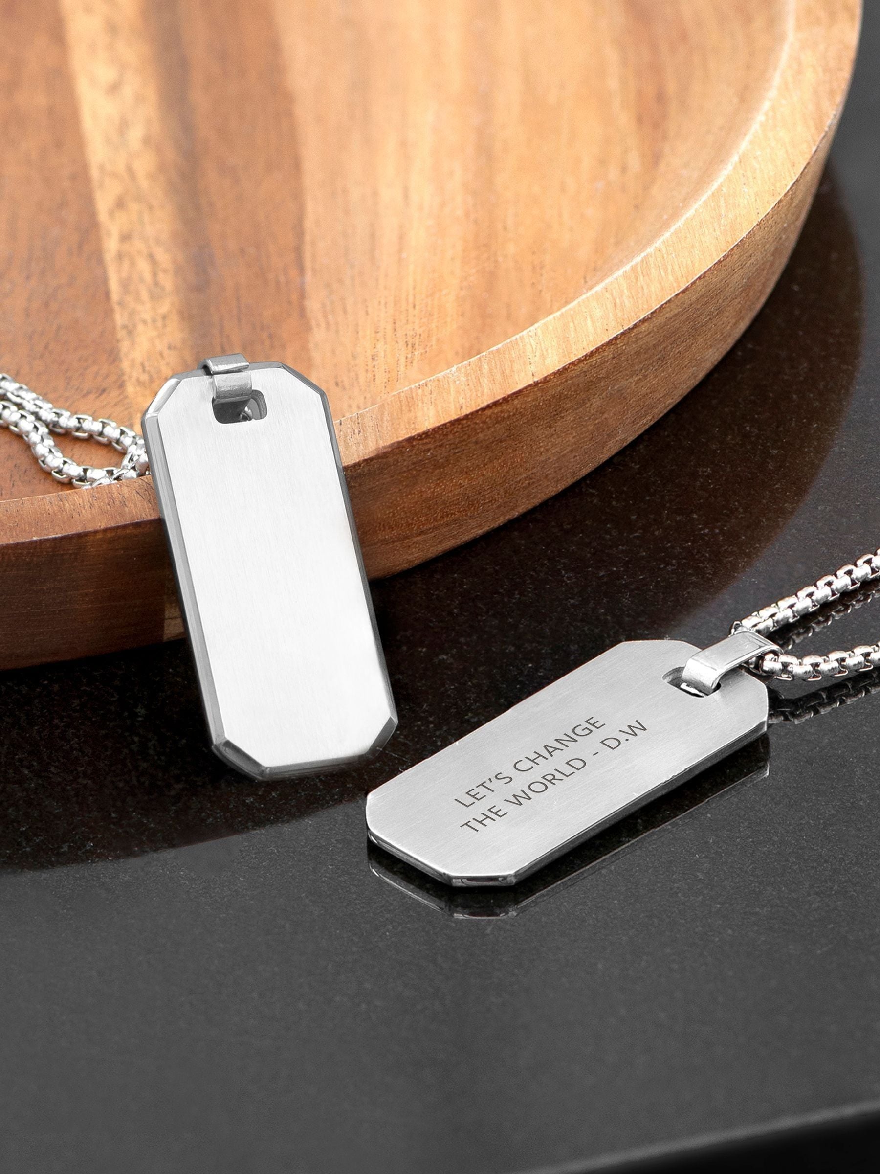 Treat the special guy in your life to a unique, fun gift this year - the Personalised Silver Men s Dog Tag Necklace! This stylish piece of jewellery is the perfect gift for birthdays, Father’s Day or Christmas for that special man in your life. Whether he wears it everyday or saves it for special occasions, this gorgeous necklace is sure to leave a lasting impression. Personalise his stunning stainless steel necklace with a heartfelt message. Message: Up to 70 characters. Chain Length: 66cm. Pendant Dimensions: 3.9cm x 1.8cm x 0.3cm.