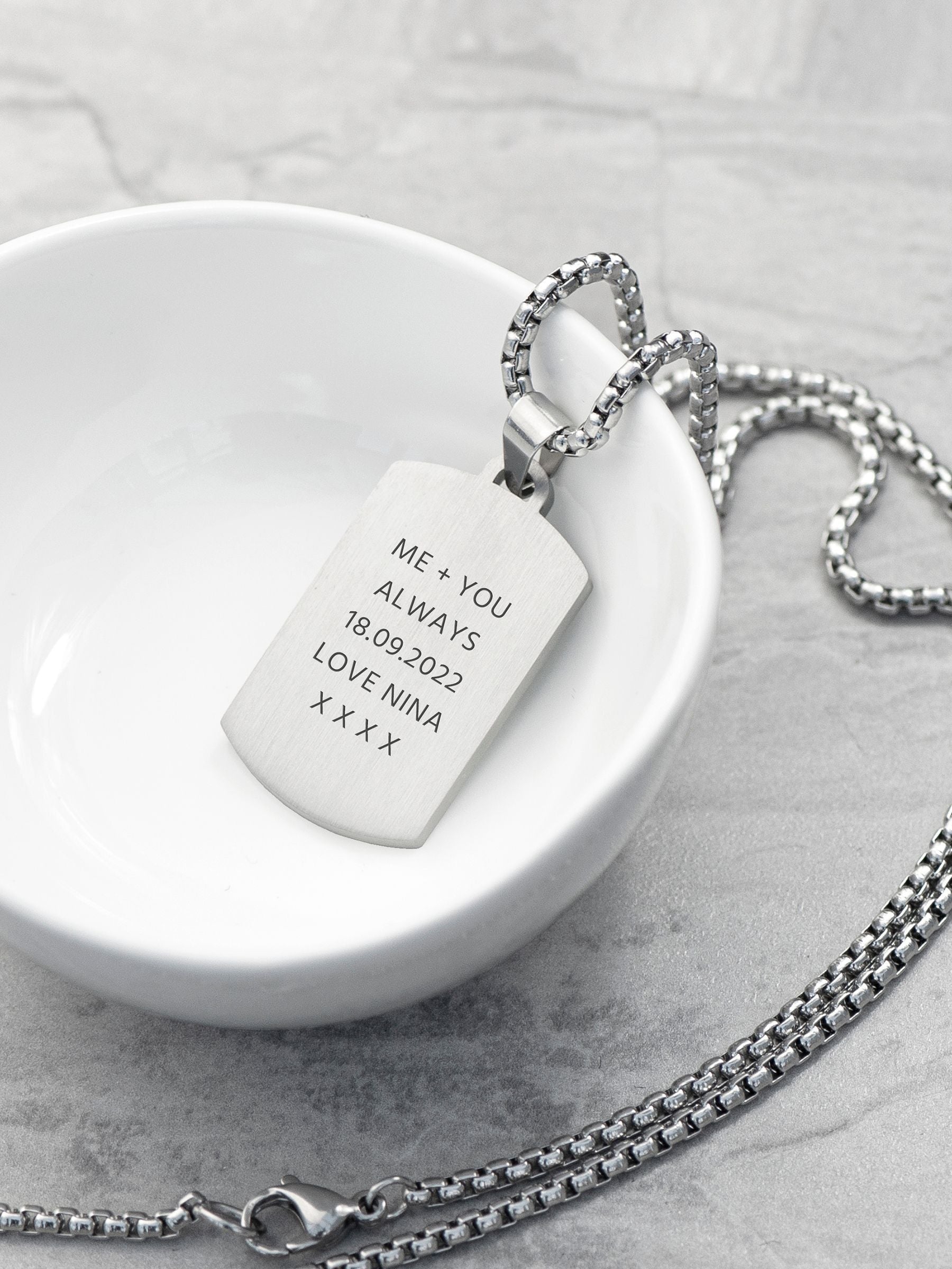 This unique and stylish personalised men's snowflake obsidian dog tag necklace would make the ideal gift for that man in your life.The dog tag pendant features crushed snowflake obsidian, a type of volcanic glass that is said to have healing properties and which symbolises balance, purification, and stability.It is a... Read More