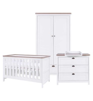 Read MoreDesigned with clean lines and finished in soft neutral colours and oak, the Verona three piece nursery furniture set promises a beautiful traditional look for your nursery. The shaker style chest changer features a fully removable changing top and the matching cot bed converts to junior bed and day bed, making this nursery set suitable for years to come. The wardrobe completes the set, and includes soft close doors and drawers, and a very convenient LED lit hanging rail that operates on a motion sensor, to make finding things easy, and also provides a soft light for changing in the middle of the night without fully waking your baby with a bright light.