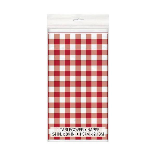 This rectangular plastic table cover is designed to protect surfaces during entertaining occasions. Featuring a classic contrast panel gingham design, this item offers a practical solution for setting up your event space quickly. Its durable construction makes it suitable for various indoor or outdoor uses, simplifying cleanup afterwards.