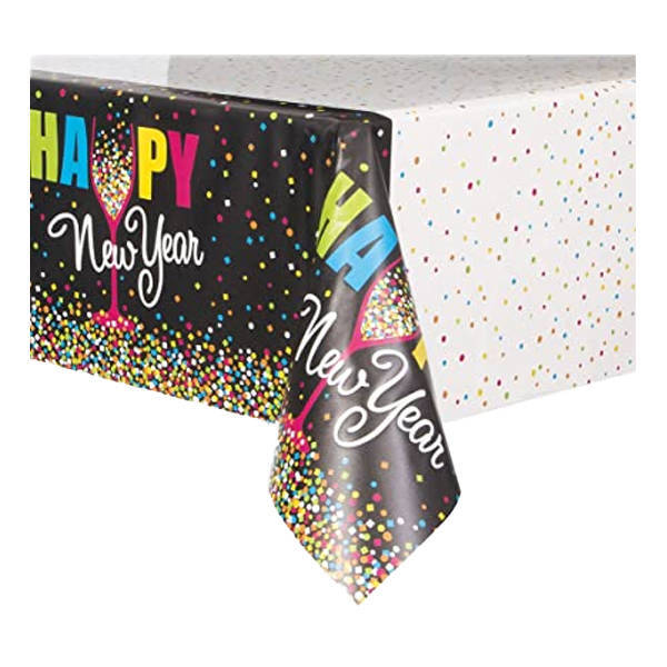 Material: Plastic. Length: 84in. Width: 54in. Design: Confetti, Text, Wine Glass. Occasion: New Year.