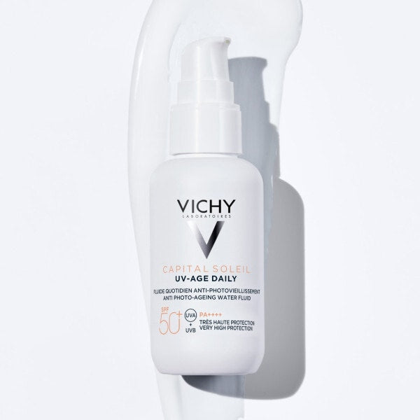 more than 80 of skin ageing signs are a result of daily uv rays and pollution suncare and skincare no longer need to work in tandem capital soleil uv age daily spf50 translucent water fluid is the perfect final skincare step to protect skin this advanced protection formula helps to protect skin against uva and uvb rays and also defends against pollution while correcting existing signs of photoageing the very high broad spectrum uva and uvb protection formula enriched with powerful dermatologicalactives peptides niacinamide and vitamin e combined with multipatented netlock technology protects the skin and helps to correct uvinduced wrinkles and dark spots while strengthening the skins defense barrier function flament f et al 2013 effect of the sun on visible clinical signs of ageing in caucasian skin clinical cosmetic and invest dermatology 6 221 232