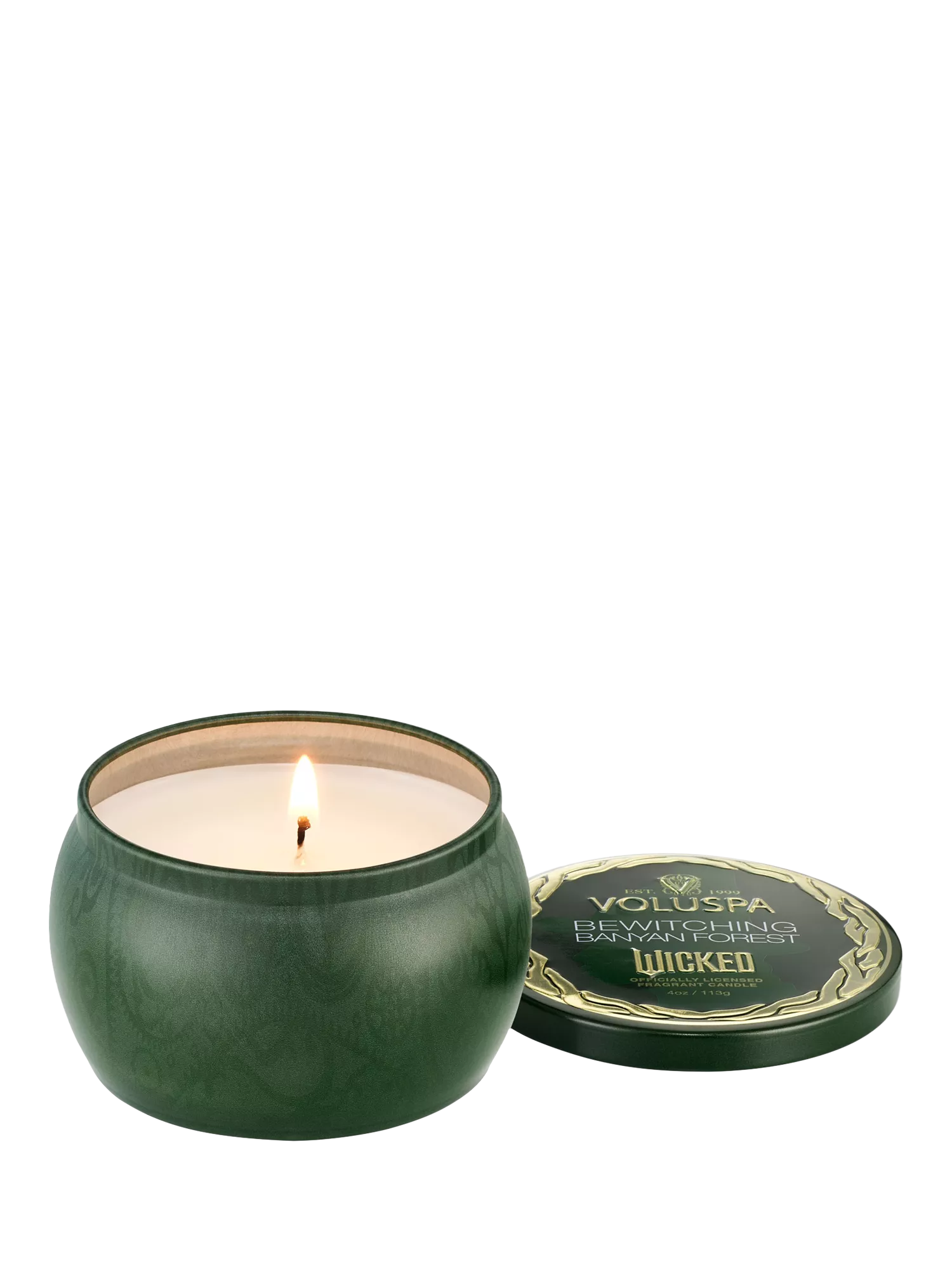 This decorative tin is a deep moody green of the canopy of a banyan forest. It comes packaged in an iconic Voluspa Mini Tin shaped green vessel. The tin candle lid features a silhouette of Elphaba's profile inside of an embossed gold-patterned frame.