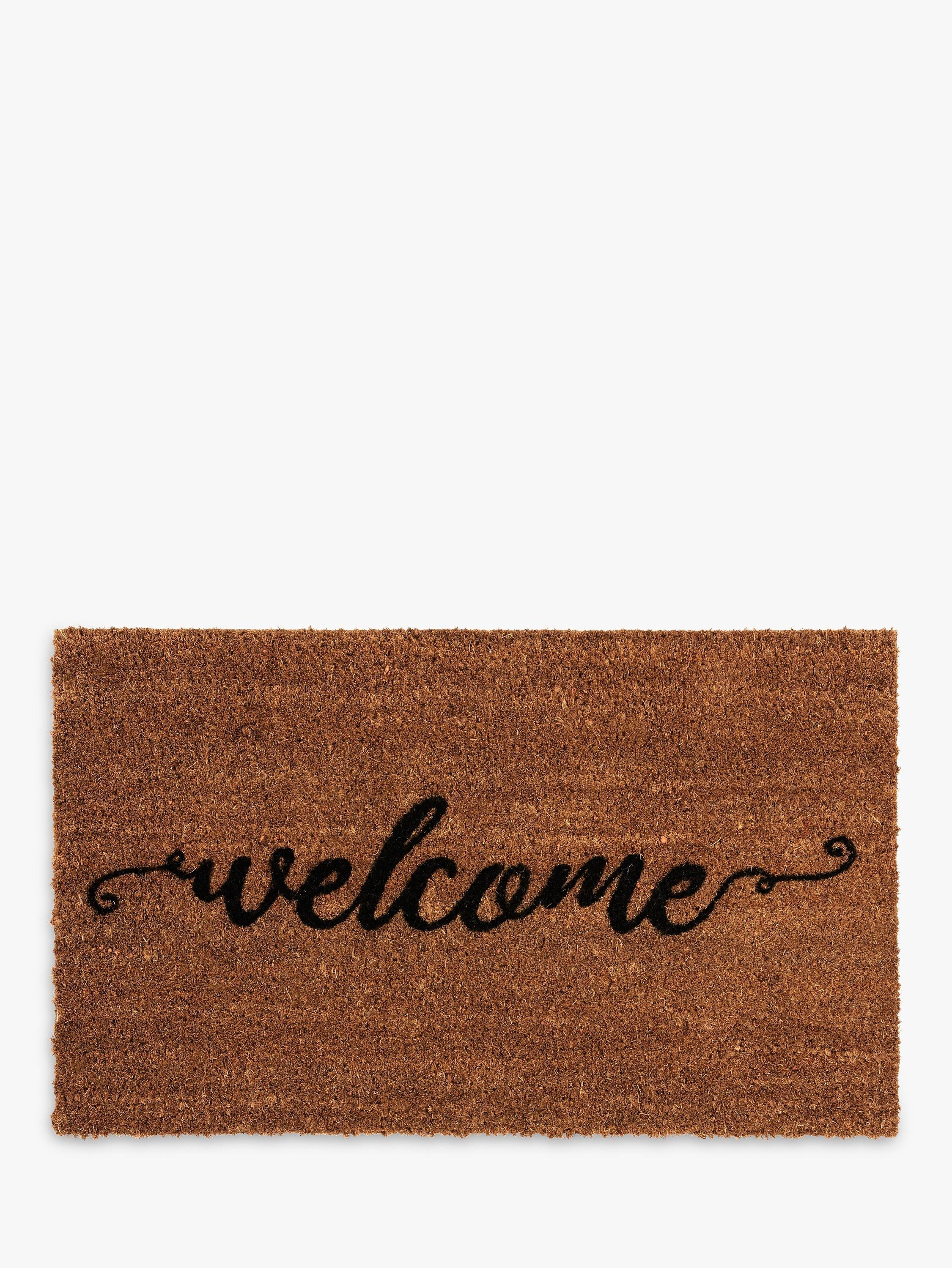 This John Lewis Door Mat features durable coir fibres expertly combined with a sturdy PVC backing for reliable home entrance protection. It displays a charming calligraphy written welcome motif, thoughtfully designed to greet all guests warmly. This practical mat suits placement inside or under sheltered outdoor conditions effectively.