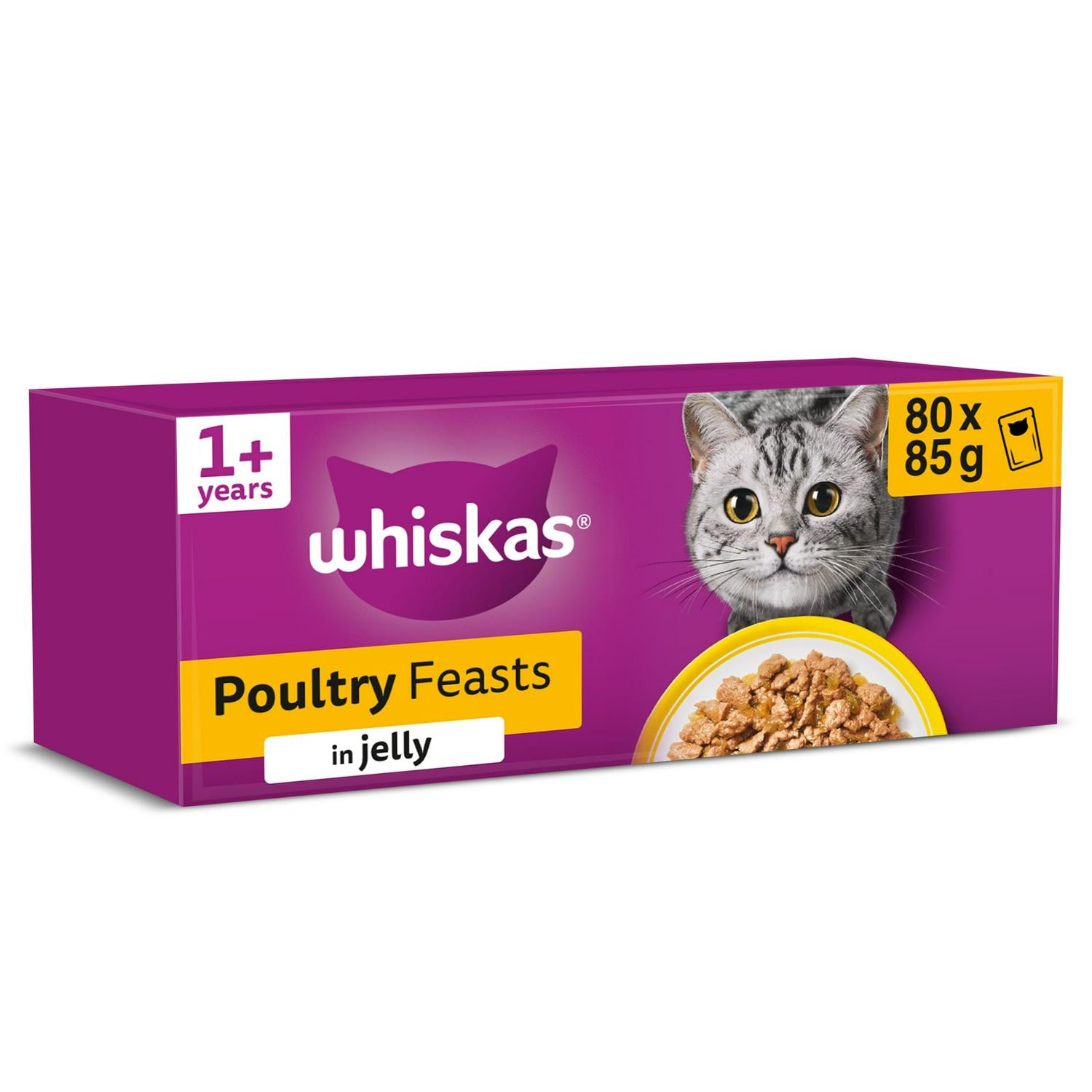 This extensive multipack offers 80 individual pouches of Whiskas 1+ Poultry Feast in Jelly, formulated as a complete wet food for adult cats. Each 85g portion contains high-quality ingredients specially prepared to preserve natural flavour and goodness. This bulk format ensures you can easily provide consistent daily nutrition for your cat across many satisfying meals.