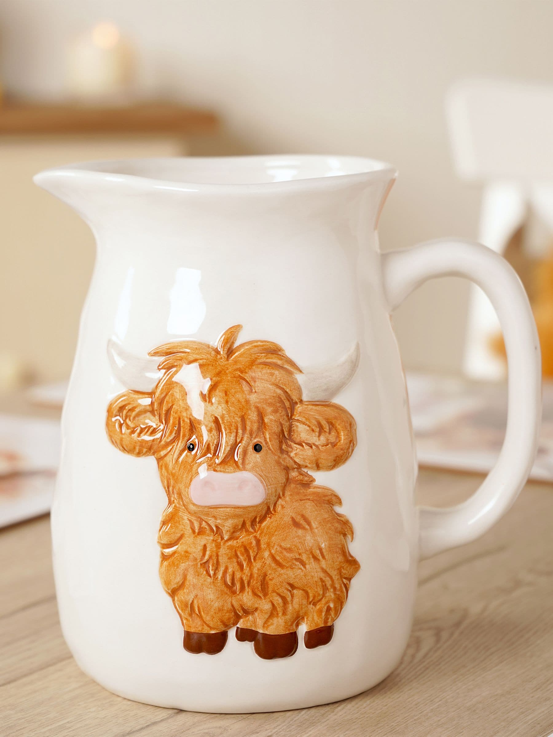 Add a little countryside cheer to your kitchen with this Highland Cow Pitcher. Featuring a sweet illustration of a Highland cow against a soft, neutral background, this ceramic jug is sure to bring a smile with every pour. Perfect for serving milk, cream, or even displaying a bunch of fresh flowers, it’s a versatile piece that blends rustic charm with everyday practicality. Size : 0.