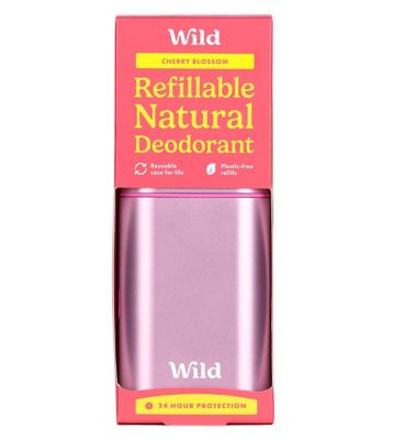 This Wild deodorant features a striking pink reusable case designed for longevity and sustainability. The product delivers 24-hour protection against odour using a natural deodorant formulation. Enjoy the subtle, pleasant fragrance of Cherry Blossom while making an eco-conscious choice for your daily routine.