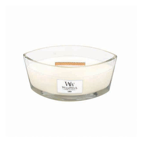 Experience the comforting glow and unique sensory experience of this WoodWick Large Ellipse candle. This 16oz candle is housed within an elegant, modern glass vessel suitable for any décor. Enjoy the soft, clean scent of fresh linen as the signature wooden wick softly crackles as it burns.