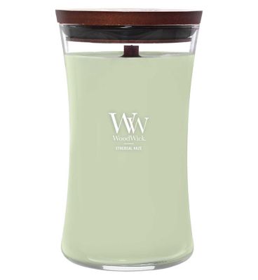 This large WoodWick hourglass candle fills your space with sophisticated fragrance notes and the signature sound of a soft crackle. It utilises a natural wooden wick to deliver a comforting, multi-sensory experience throughout its burn time. The Ethereal Haze variant offers a specific fragrance profile combining tangy elements with sweet, ripe red raspberries.