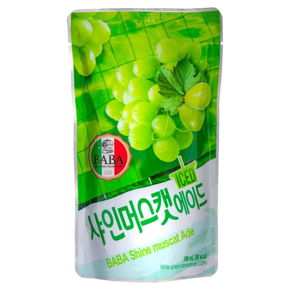 Woongjin Baba Shine Muscat Ade is a refreshing, sparkling drink featuring the sweet and fragrant flavor of Shine Muscat grapes. Known for their natural sweetness and floral aroma, these premium grapes give the ade a light and fruity profile with a delicate fizz, making it a perfect refreshment. This beverage captures the essence of the Shine Muscat grapes, delivering a crisp and enjoyable experience, ideal for hot days or as a fruity treat. Its balance of sweetness and sparkling freshness makes it popular among those who enjoy light, grape-flavored drinks.