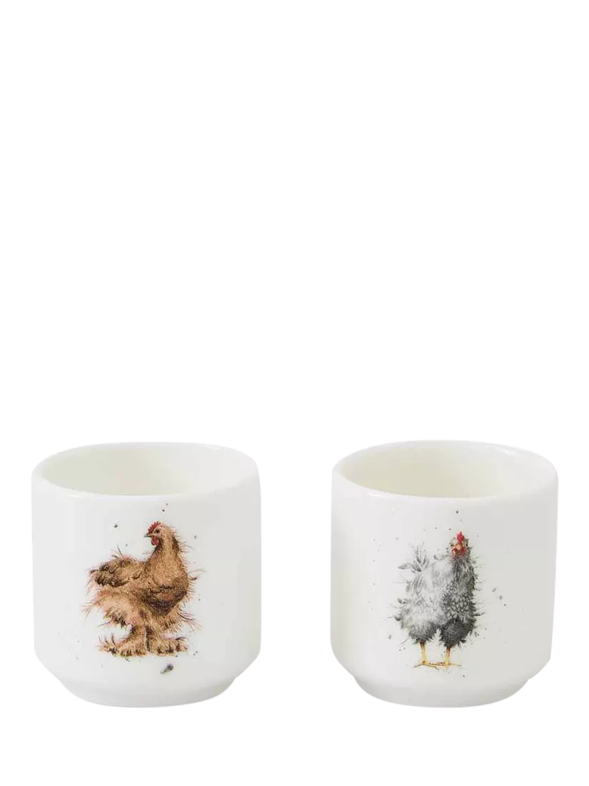 Pair of fine bone china egg cups from Royal Worcester Wrendale Designs, featuring two feathery chicken designs. A great addition to the breakfast table. Dishwasher and microwave-safe.