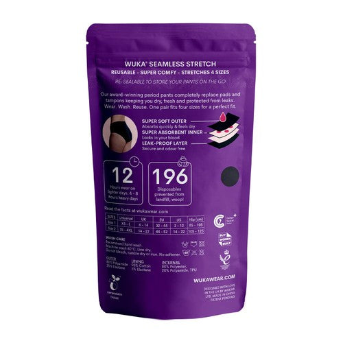 These WUKA Stretch period pants offer multi-size coverage, designed to fit body sizes from XL up to 4XL comfortably. They feature a seamless construction for superior discretion and comfort under clothing. Enjoy reliable protection suitable for your heaviest days.