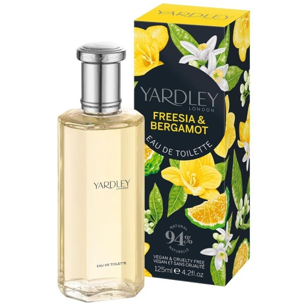 Yardley London's Freesia & Bergamot is a refreshing, light citrus floral fragrance with energising top notes of bergamot, lemon, mandarin, and cypress. The scent leads into a vibrant and aromatic floral heart that combines freesia, lily of the valley, ginger and pepper, enhanced with a warm, sensual base of sandalwood, musk and amber.