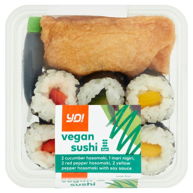 This YO Vegan Sushi selection provides a convenient, prepared assortment of classic rolls and nigiri pieces ready for immediate consumption. The 127g pack features a variety of fresh vegetable sushi, making it a simple option for lunch or a plant-based snack.