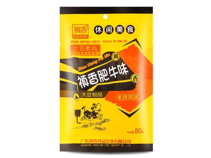 Zhen Xiang\u2019s Beef Flavoured Soy Meat is a unique and flavourful seasoned faux meat snack. This savoury treat is made from soy, or beancurd, that has been combined with a rich seasoning of herbs and spices. Beancurd, or as its more commonly known \\tofu\\, is made from ground, pressed soybeans, and has been eaten for over 2,000 years. It is a popular ingredient across Asian cuisine, providing dishes with high amounts of protein while still being suitable for vegetarians. This soy \u201cmeat\u201d snack has been flavoured to resemble beef and that hearty, meaty flavour comes through. A savoury treat for individuals looking to be a bit more health conscious.